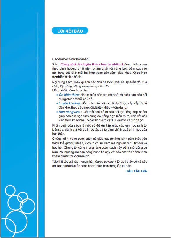 • Rèn năng lực: Cuối mỗi chủ đề là các bài tập tổng hợp nhằm giúp các em học sinh củng cố, tổng hợp kiến thức, liên kết các kiến thức khác nhau ở các lĩnh vực Vật lí, Hoá học và Sinh học. Phần cuối của sách là một số đề ôn tập giúp các em học sinh tự kiểm tra, đánh giá kết quả học tập và tự điều chỉnh quá trình học của
