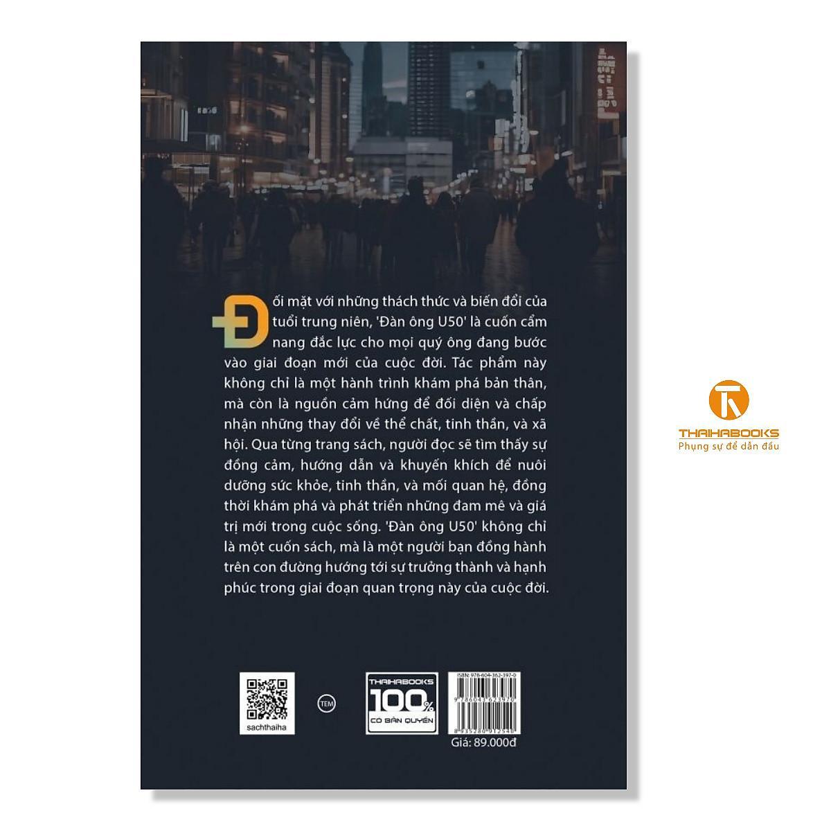 [ThaiHaBooks] Đàn ông U50 là cuốn cẩm nang đắc lực cho mọi quý ông đang bước vào giai đoạn mới của cuộc đời – tuổi trung niên với đầy những thách thức và biến đổi. Tác phẩm này không chỉ là hành trình giúp người đọc khám phá bản thân, mà còn là nguồn cảm hứng để người đọc đối diện và chấp nhận những thay dổi về thể chất, tinh thần và xã hội. Qua từng trang sách, người đọc sẽ tìm thấy sự đồng cảm, hướng dẫn và khuyến khích để nuôi dưỡng sức khoẻ, tinh thần và mối quan hệ, đồng thời khám phá và phát triển những đam mê và giá trị mới trong cuộc sống. Không chỉ là một cuốn sách, Đàn ông U50 còn là một người bạn đồng hành của các quý ông trên con đường hướng tới sự trưởng thành và hạnh phúc trong giai đoạn quan trọng này của cuộc đời.