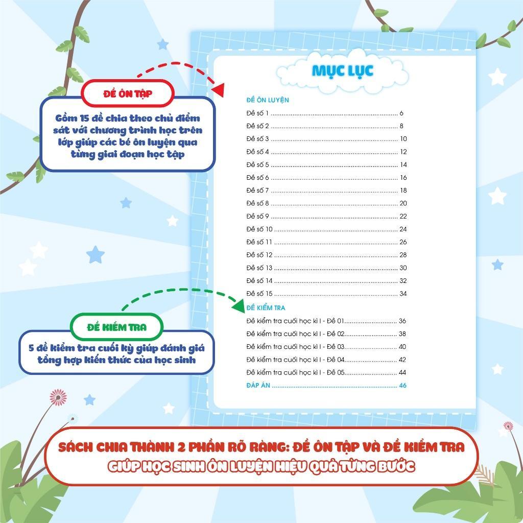 Mỗi cuốn sách cung cấp 5 đề kiểm tra cuối học kì để kiểm tra, đánh giá kiến thức tổng hợp của học sinh.