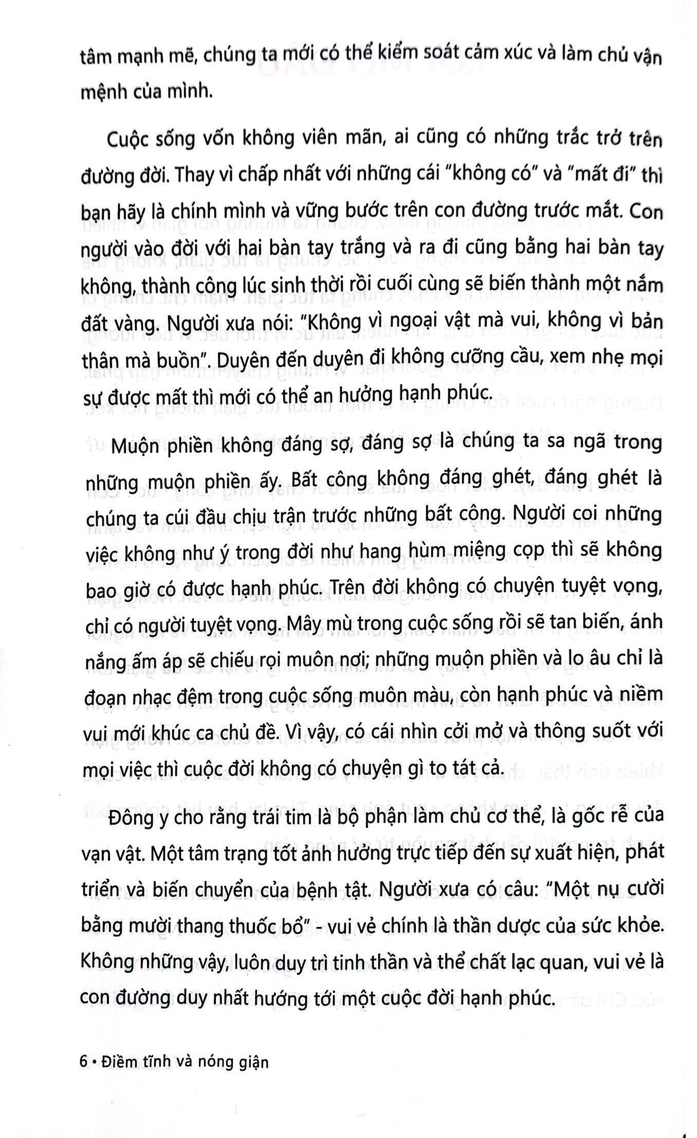 Dân gian vốn có câu “cả giận mất khôn”, Đức Phật cũng đã dạy “một ngọn lửa sân đốt cháy rừng công đức”. Cơn nóng giận có thể hủy diệt sức khỏe, sự nghiệp, tình cảm và hạnh phúc của chúng ta. Cơn giận khiến đầu óc ta bốc hỏa, kích động và lỗ mãng để rồi phạm phải những sai lầm không thể bù đắp. Nóng giận là trừng phạt bản thân bằng lỗi lầm của người khác, đánh cược hạnh phúc cả đời bằng một phút thiếu kiềm chế. Hầu hết những bất hạnh trong đời đều từ đó mà ra. Bởi thế, mỗi người chúng ta sống trong xã hội này đều cần rèn giũa cho m.ình một thái độ sống điềm tĩnh trước mọi điều.