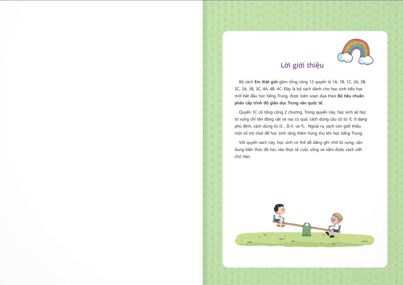 Em Thật Giỏi - 1C Em thật giỏi là bộ sách dành cho học sinh tiểu học mới bắt đầu học tiếng Trung, được biên soạn dựa theo Bộ tiêu chuẩn phân cấp trình độ