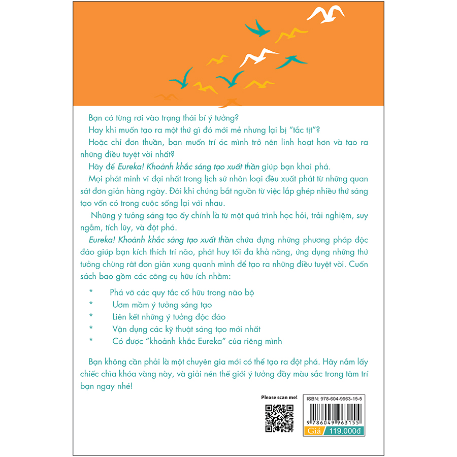 - Hãy để Eureka! Khoảnh khắc sáng tạo xuất thần giúp bạn khai phá Mọi phát minh vĩ đại nhất trong lịch sử nhân loại đều xuất phát từ những quan sát đơn giản hàng ngày. Đôi khi chúng bắt nguồn từ việc lắp ghép nhiều thứ sáng tạo vốn có trong cuộc sống lại với nhau. Những ý tưởng sáng tạo ấy chính là từ một quá trình học hỏi, trải nghiệm, suy ngẫm, tích lũy, và đột phá. Eureka! Khoảnh khắc sáng tạo xuất thần chứa đựng những phương pháp độc đáo giúp bạn kích thích trí não, phát huy tối đa khả năng, ứng dụng những thứ tưởng chừng rât đơn giản xung quanh mình để tạo ra những điều tuyệt vời. Cuốn sách bao gồm các công cụ hữu ích nhằm: