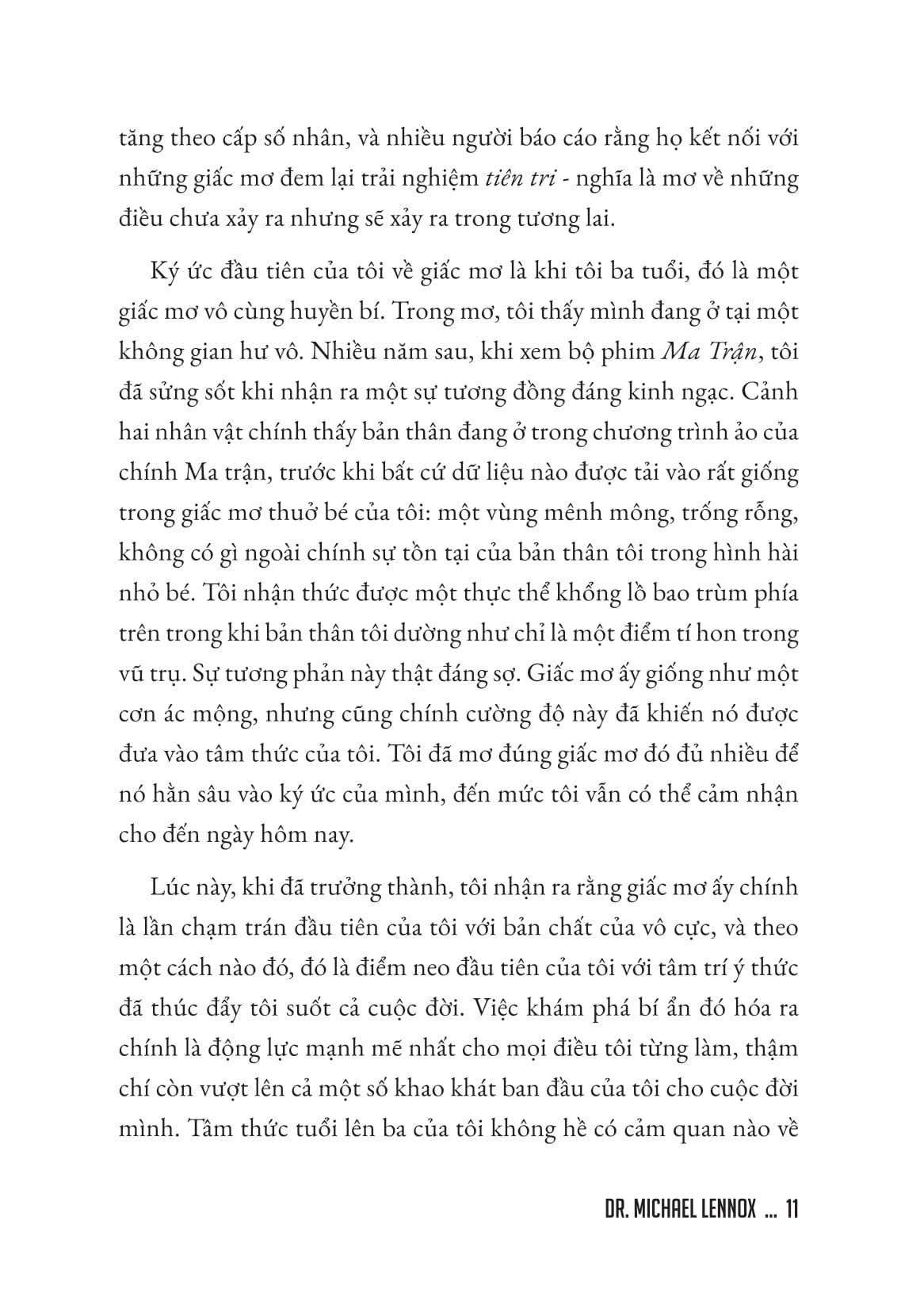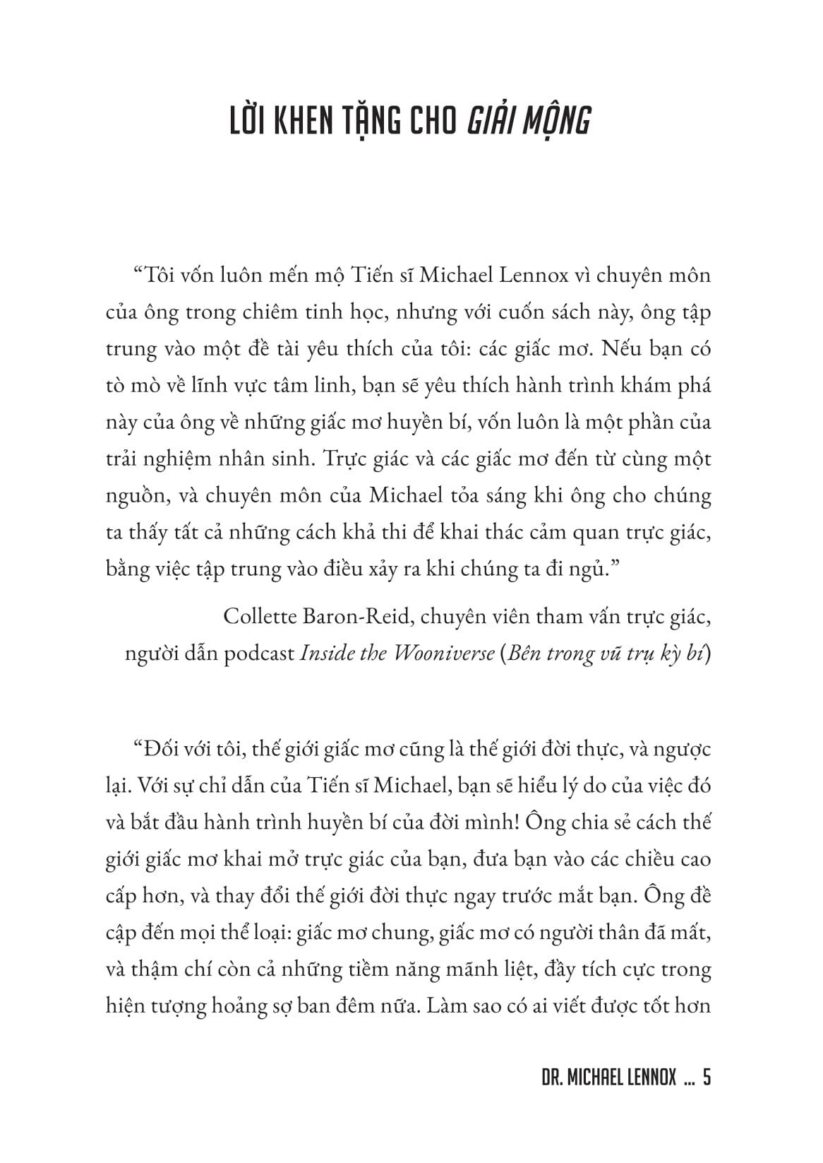 Giải Mộng - Giải Mã Mối Liên Kết Giữa Trực Giác Và Giấc Mơ Giấc mơ không đơn thuần là những hình ảnh thoáng qua trong tâm trí khi ta say ngủ. Chúng là cánh cửa dẫn vào thế giới trực giác, tâm linh và những chiều không gian huyền bí mà ta ít khi nhận ra khi tỉnh thức. Trong GIẢI MỘNG - Giải mã mối liên kết giữa trực giác và giấc mơ, Tiến sĩ Michael Lennox sẽ giúp bạn khai phá sức mạnh tiềm ẩn của giấc mơ, mở ra con đường kết nối với trực giác thông qua nghệ thuật giải mã giấc mơ. Dựa trên chính những trải nghiệm của ông và hàng ngàn khách hàng, Dr. Lennox phân chia giấc mơ thành nhiều dạng đặc biệt như giấc mơ tiên tri, giấc mơ sáng suốt, giấc mơ chung, giấc mơ thăm viếng… Bạn sẽ học cách nhìn thấy dấu hiệu của tương lai, đón nhận thông điệp từ người đã khuất và bước vào những hành trình của trực giác và tâm trí đầy huyền diệu. Không dừng lại ở việc diễn giải giấc mơ, GIẢI MỘNG còn mang đến những phương pháp thực hành cụ thể để khai mở tiềm năng tâm linh và thậm chí biến những cơn ác mộng thành cơ hội chuyển hóa bản thân.