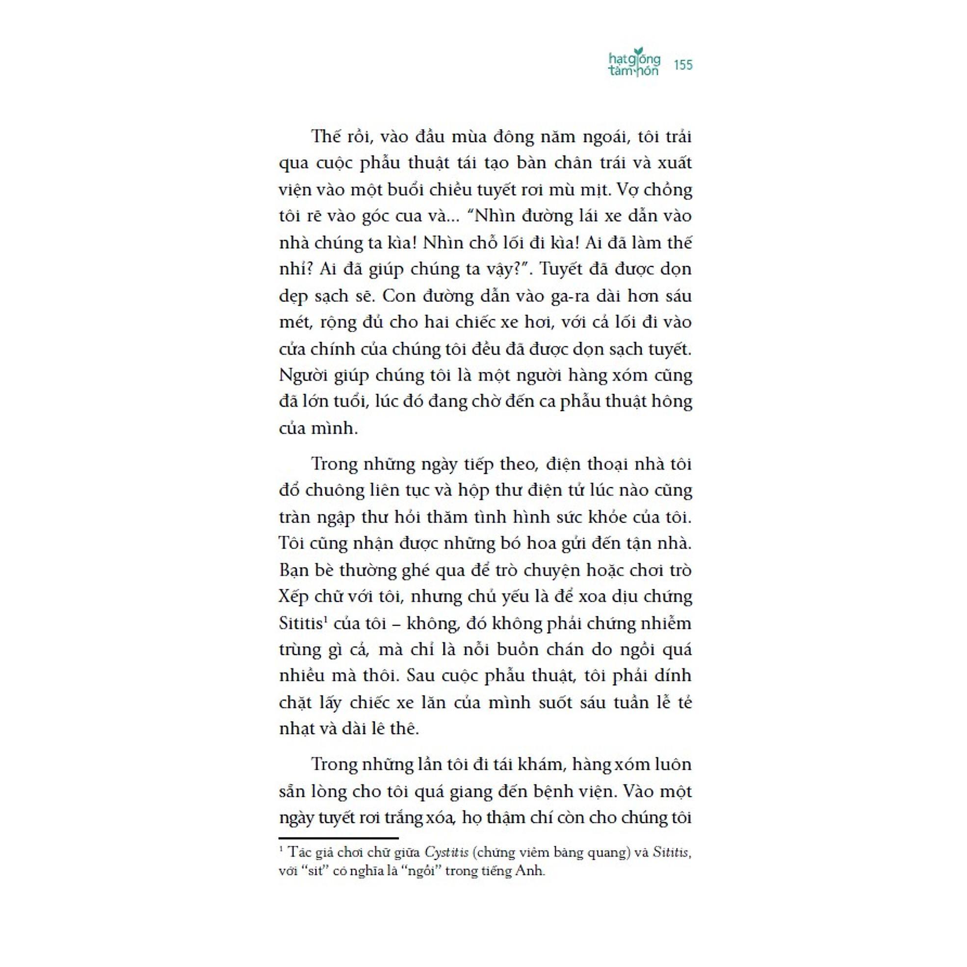 Ở thời đại mà những tin tức xã hội tiêu cực tràn ngập mặt báo, các chủ đề về bạo lực, chiến tranh hay tiêu đề giật gân về đời sống riêng tư của người nổi tiếng lại là từ khóa được nhiều người tìm kiếm, thật khó để tin rằng thế giới này vẫn còn tồn tại tình yêu thương, sự tử tế hay những hành động giúp đỡ vô điều kiện giữa người với người. Dù vậy, tử tế vẫn là một trong những điều tốt đẹp nhất mà chúng ta có thể trao cho nhau. Sự tử tế không nhất thiết phải là những việc quá lớn lao, mà chúng có thể bắt nguồn từ những hạt mầm bé nhỏ được ta “gieo trồng” mỗi ngày. Đó có thể chỉ là những hành động đơn giản và ngẫu nhiên, nhưng theo thời gian, với “sự chăm bón” đúng cách, chúng có thể tạo nên những thay đổi lớn lao không chỉ cho mỗi cá nhân mà còn cho cộng đồng và thế giới. Đây cũng chính là thông điệp nhân văn mà quyển sách mang đến cho độc giả. Quyển sách gồm 27 câu chuyện đời thường đầy gần gũi và cảm động nói về lòng tốt và sự tử tế trong cuộc sống. Với văn phong giản dị nhưng không kém phần sâu sắc, khiến bạn cảm nhận được tình yêu thương vẫn luôn tồn tại dù cuộc đời này có khắc nghiệt đến đâu đi nữa. Và bạn sẽ nhận ra rằng khi bạn dịu dàng với thế giới này, bạn cũng sẽ nhận lại sự dịu dàng từ thế giới. Nối tiếp chủ đề ý nghĩa về sự tử tế của Bộ sách Hạt Giống Tâm Hồn, không mang đến những câu chuyện truyền cảm hứng về cuộc đời của một vĩ nhân hay một người nổi tiếng nào, mà quyển sách chứa đựng những câu chuyện bình dị mà ta dễ dàng bắt gặp trong cuộc sống hằng ngày. Đó có thể là câu chuyện của cậu bé Arthur cực kỳ thông minh nhưng mắc chứng tự kỷ sẵn sàng nhường đĩa bánh tiramisu yêu thích cho một người ăn xin bên đường. Hay câu chuyện về bác tài xế Mike tốt bụng cho hai cô sinh viên bị hỏng xe đi nhờ một đoạn đường giữa đêm bão tuyết, nhờ vậy mà vô tình cứu hai cô gái thoát khỏi vụ tai nạn kinh hoàng chỉ vài phút sau đó. Và còn nhiều câu chuyện nhân văn giàu ý nghĩa khác sẽ chạm đến trái tim bạn. Những cung bậc cảm xúc len lỏi trên từng trang sách sẽ giúp bạn nhận ra cuộc sống vốn muôn màu muôn vẻ. Mỗi người mà ta gặp trên đường đời này không ai là ngẫu nhiên và những hành động tử tế của bạn dành cho họ không điều gì là vô ích. Cũng trong quyển sách này, bạn sẽ bắt gặp được hình ảnh của chính mình, của những người xung quanh, hoặc đứng ở vị trí “người ngoài cuộc” để chiêm nghiệm, khám phá những điều thật sự ý nghĩa và tìm ra châm ngôn sống cho chính mình. Khép lại quyển sách , hy vọng bạn sẽ có thêm động lực để yêu thương bản thân và những người xung quanh bằng cách giúp đỡ mọi người, ngay cả khi đó là một hành động nhỏ. Hy vọng những hạt mầm tử tế từ những việc nhỏ này sẽ được gieo trong tâm hồn bạn, để từ đó được bạn vun trồng, tưới mát rồi có một ngày bạn sẽ nhận được quả ngọt mà hạt mầm nhỏ ấy mang lại.