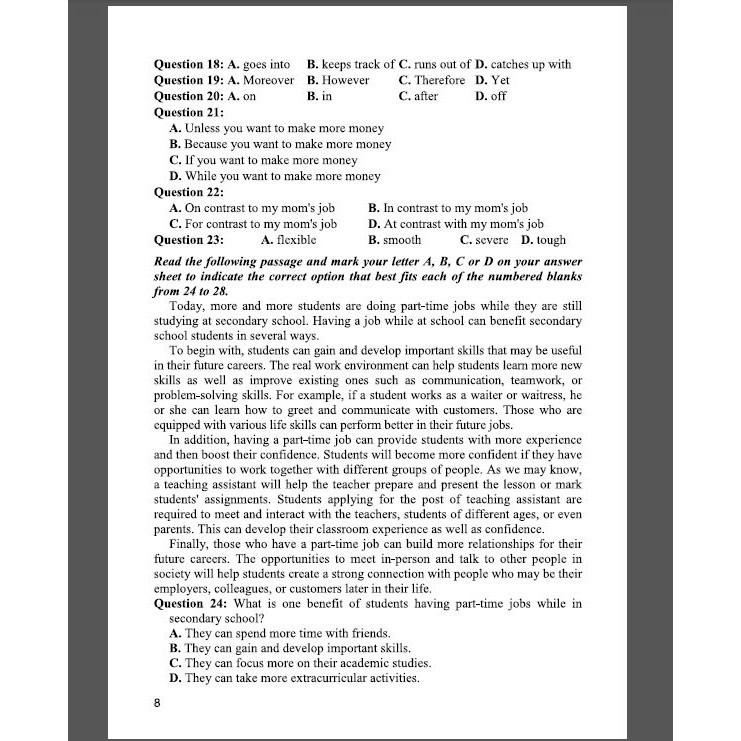 Phần hướng dẫn giải chi tiết các câu hỏi sau mỗi đề luyện tập sẽ giúp các bạn nắm vững cách giải quyết các vấn đề thường gặp trong các kì thi. Phần hướng dẫn này cũng sẽ giúp các bạn ôn tập những từ ngữ chủ yếu và những chủ điểm ngữ pháp quan trọng trong chương trình Tiếng Anh phổ thông.