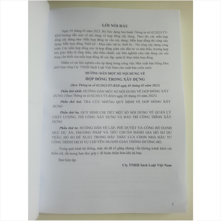 - Toàn bộ sách bìa mềm khổ lớn 19 x 27 cm phân phối bởi Nhà sách Nam Việt đều được bọc sách Plastic MIỄN PHÍ và xuất hóa đơn điện tử đầy đủ, nhanh chóng. .../... Lời giới thiệu: Ngày 03 tháng 03 năm 2023, Bộ Xây dựng ban hành Thông tư số 02/2023/TT-BXD hướng dẫn một số nội dung về hợp đồng xây dựng. Theo đó, các mẫu hợp đồng xây dựng như: Mẫu hợp đồng tư vấn xây dựng; Mẫu hợp đồng thi công xây dựng; Mẫu hợp đồng Thiết kế - Mua sắm vật tư, thiết bị - Thi công xây dựng công trình. Các mẫu hợp đồng này là hợp đồng giữa chủ đầu tư và nhà thầu, trường hợp bên giao thầu là tổng thầu, nhà thầu chính, các bên nghiên cứu vận dụng các nội dung cần thiết của mẫu hợp đồng để xác lập, quản lý thực hiện hợp đồng. Nhằm phổ biến đến Quý Cơ quan, Đơn vị và Quý khách hàng thân thiết nắm bắt kịp thời những quy định mới nêu trên. Nhà sách Nam Việt xin trân trọng giới thiệu cuốn sách: HƯỚNG DẪN MỘT SỐ NỘI DUNG VỀ HỢP ĐỒNG TRONG XÂY DỰNG (theo Thông tư số 02/2023/TT-BXD ngày 03 tháng 03 năm 2023 của Bộ Xây dựng) .../... Nội dung sách gồm 4 phần sau: Phần thứ nhất. HƯỚNG DẪN MỘT SỐ NỘI DUNG VỀ HỢP ĐỒNG XÂY DỰNG (Theo Thông tư số 02/2023/TT-BXD ngày 03 tháng 03 năm 2023) Phần thứ hai. TRA CỨU NHỮNG QUY ĐỊNH VỀ HỢP ĐỒNG XÂY DỰNG Phần thứ ba. QUY ĐỊNH CHI TIẾT MỘT SỐ NỘI DUNG VỀ QUẢN LÝ CHẤT LƯỢNG, THI CÔNG XÂY DỰNG VÀ BẢO TRÌ CÔNG TRÌNH XÂY DỰNG Phần thứ tư. HƯỚNG DẪN VỀ LẬP, PHÊ DUYỆT VÀ CÔNG BỐ DANH MỤC DỰ ÁN; PHƯƠNG PHÁP VÀ TIÊU CHUẨN ĐÁNH GIÁ HỒ SƠ DỰ THẦU, HỒ SƠ ĐỀ XUẤT TRONG ĐẤU THẦU LỰA CHỌN NHÀ ĐẦU TƯ CÔNG TRÌNH DỊCH VỤ CHUYÊN NGÀNH GIAO THÔNG ĐƯỜNG BỘ .../... Cảm ơn các bạn đã ghé thăm shop Nhà sách Nam Việt rất nhiều ạ! Sách HƯỚNG DẪN MỘT SỐ NỘI DUNG VỀ HỢP ĐỒNG TRONG XÂY DỰNG (theo Thông tư số 02/2023/TT-BXD ngày 03 tháng 03 năm 2023 của Bộ Xây dựng) Sách HƯỚNG DẪN MỘT SỐ NỘI DUNG VỀ HỢP ĐỒNG TRONG XÂY DỰNG (theo Thông tư số 02/2023/TT-BXD ngày 03 tháng 03 năm 2023 của Bộ Xây dựng)
