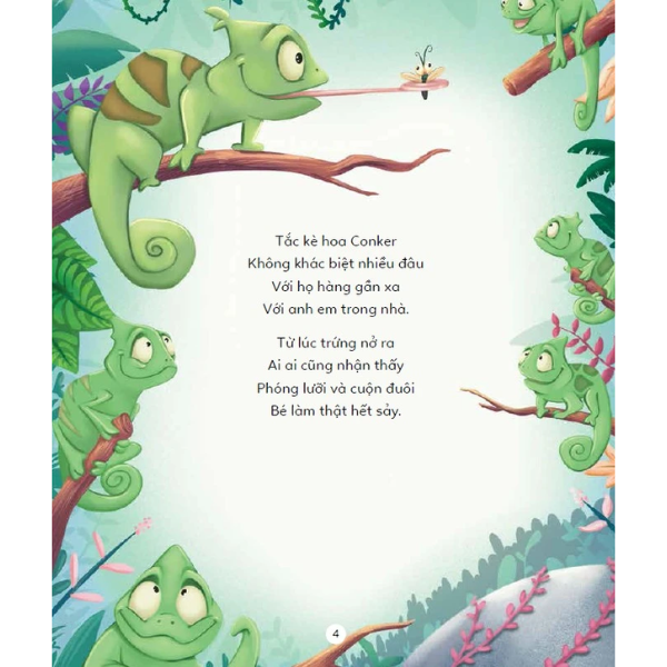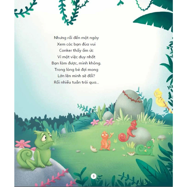 Bộ sách gồm 4 quyển sách tranh: “Tắc kè hoa Conker”, “Tắc kè hoa Conker và cái bẫy khỉ”, “Voi con học leo cây”, và “Bé Kiwi Mũi Kỳ Lân” kể về hành trình khám phá giá trị bản thân của các bạn động vật nhỏ trong khu rừng rộng lớn.