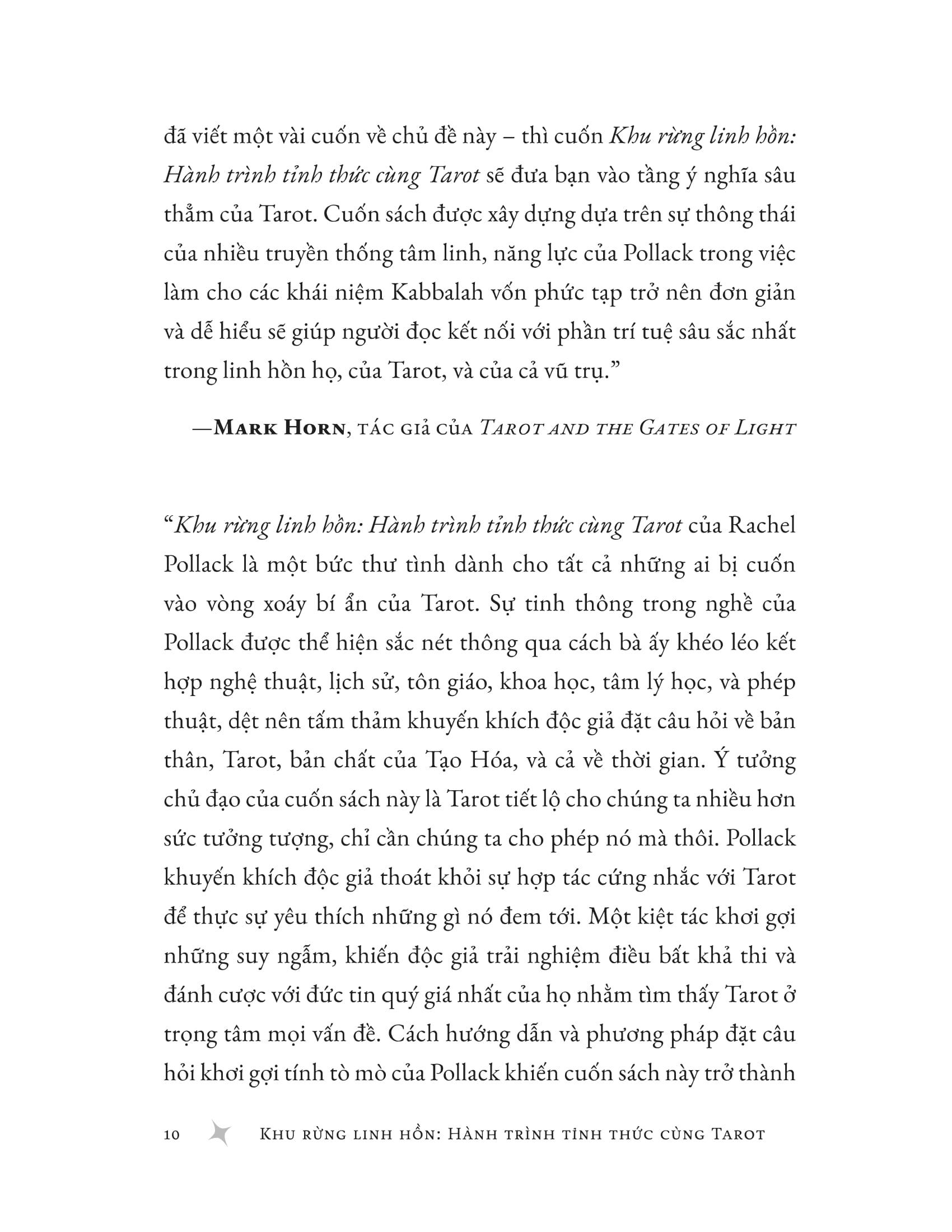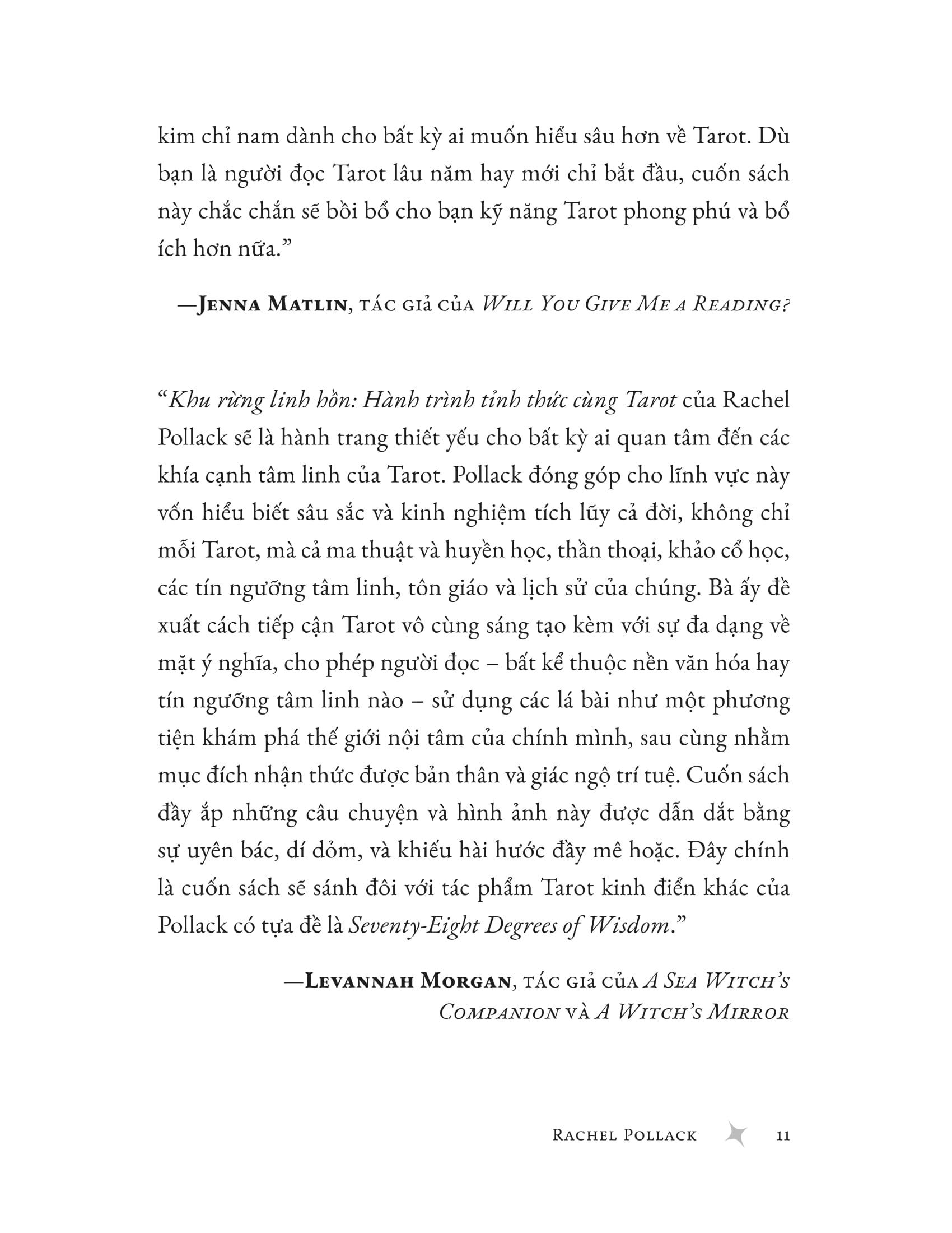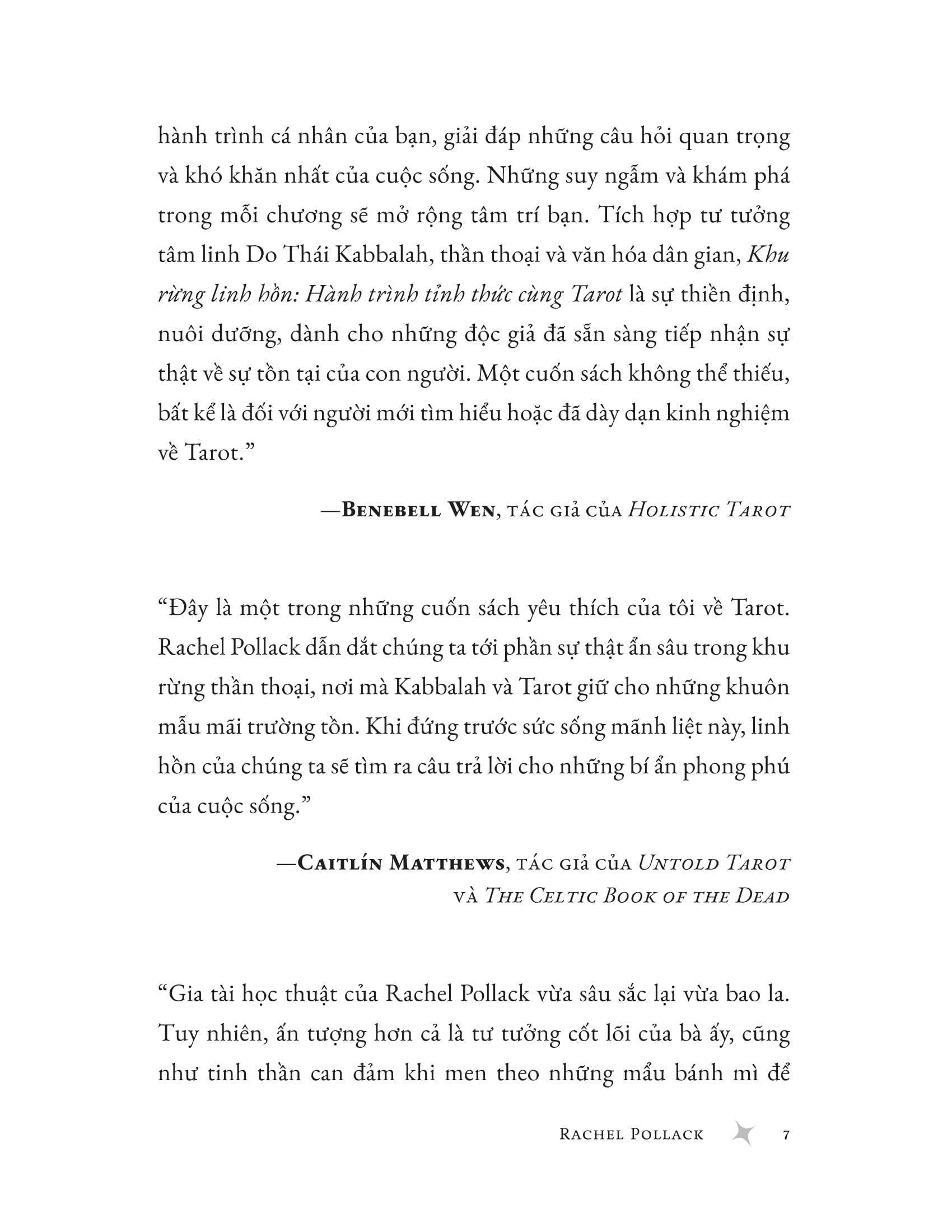 Mua tại Tiktokkhu rừng linh hồn - hành trình tỉnh thức cùng tarot dành cho những người tìm kiếm con đường tâm linh, khu rừng linh hồn: hành trình tỉnh thức cùng tarot mở ra một lối đi khác biệt với các sách dạy “cách đọc bài” thông thường. thay vì diễn giải từng lá bài, chuyên gia tarot rachel pollack mời bạn dạo bước trong khu rừng tarot, nơi mà bạn sẽ bắt gặp tất cả những biểu tượng cổ xưa, giải mã tiếng nói của chúng, và học cách kết nối với chiều sâu linh hồn m.ình. trong khu rừng này, bạn sẽ học được:
