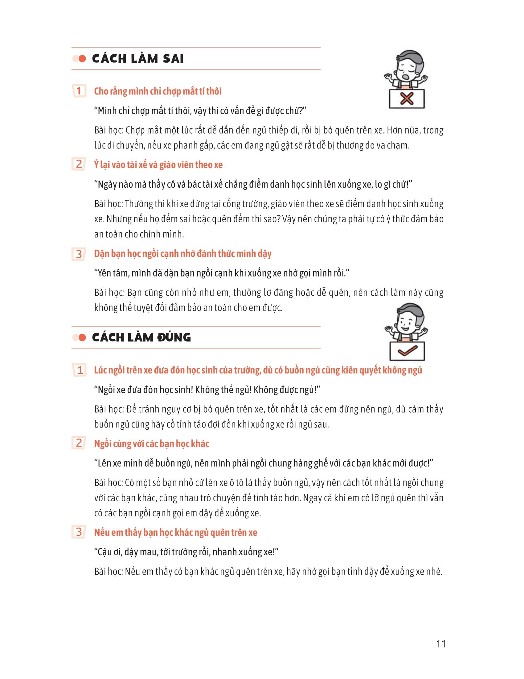 Cuốn sách gồm 5 chương với 35 bối cảnh, về cơ bản sẽ bao quát hết các khía cạnh đời sống học đường của trẻ. Cuốn sách này có thể coi như một bộ học liệu đào tạo có tính hệ thống để trẻ tự học về kiến thức an toàn khi đi học hoặc có thể coi như cẩm nang hướng dẫn giúp trẻ tìm ra câu trả lời cho các vấn đề an toàn tại trường học mà trẻ gặp phải.