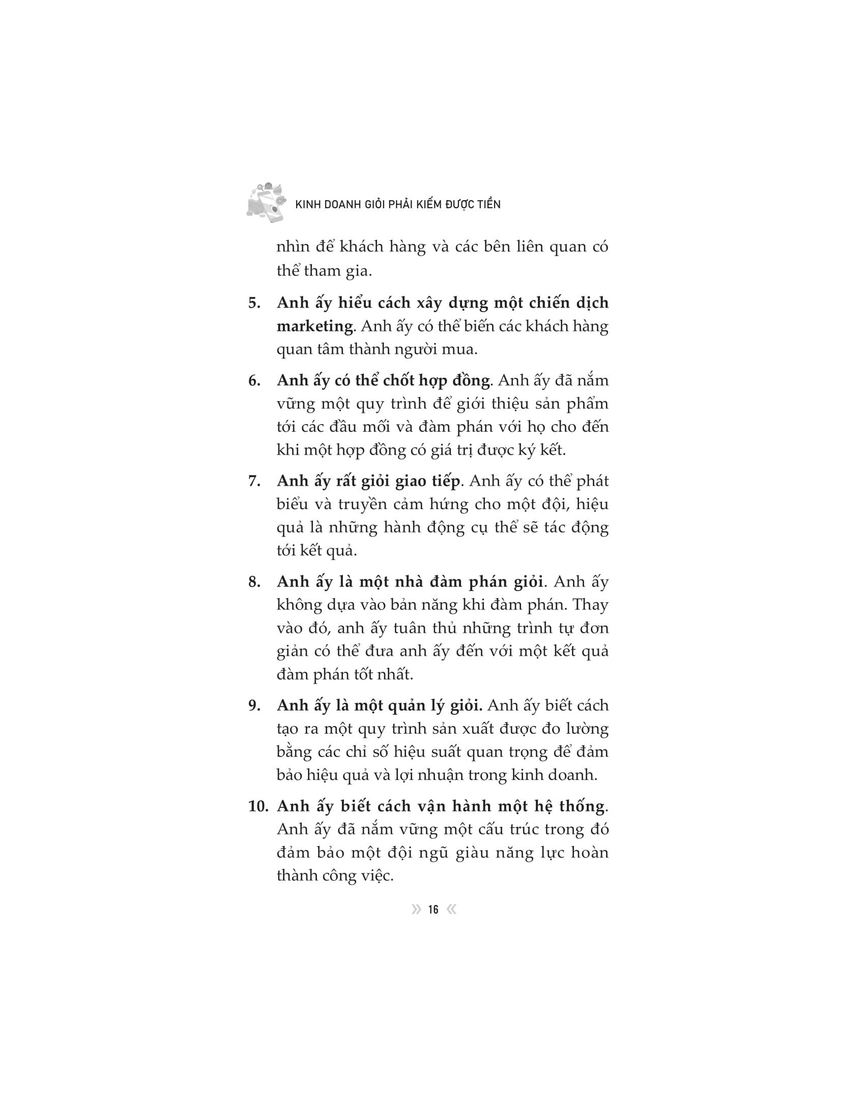 “Kinh doanh giỏi phải kiếm được tiền” – cuốn sách chứa đựng những bài học giá trị để phát triển sự nghiệp cá nhân và xây dựng một doanh nghiệp phát triển bền vững. Cuốn sách này tập trung vào 9 lĩnh vực mà những nhà lãnh đạo hay những người làm kinh doanh cần mài giũa và thông thạo, bao gồm: