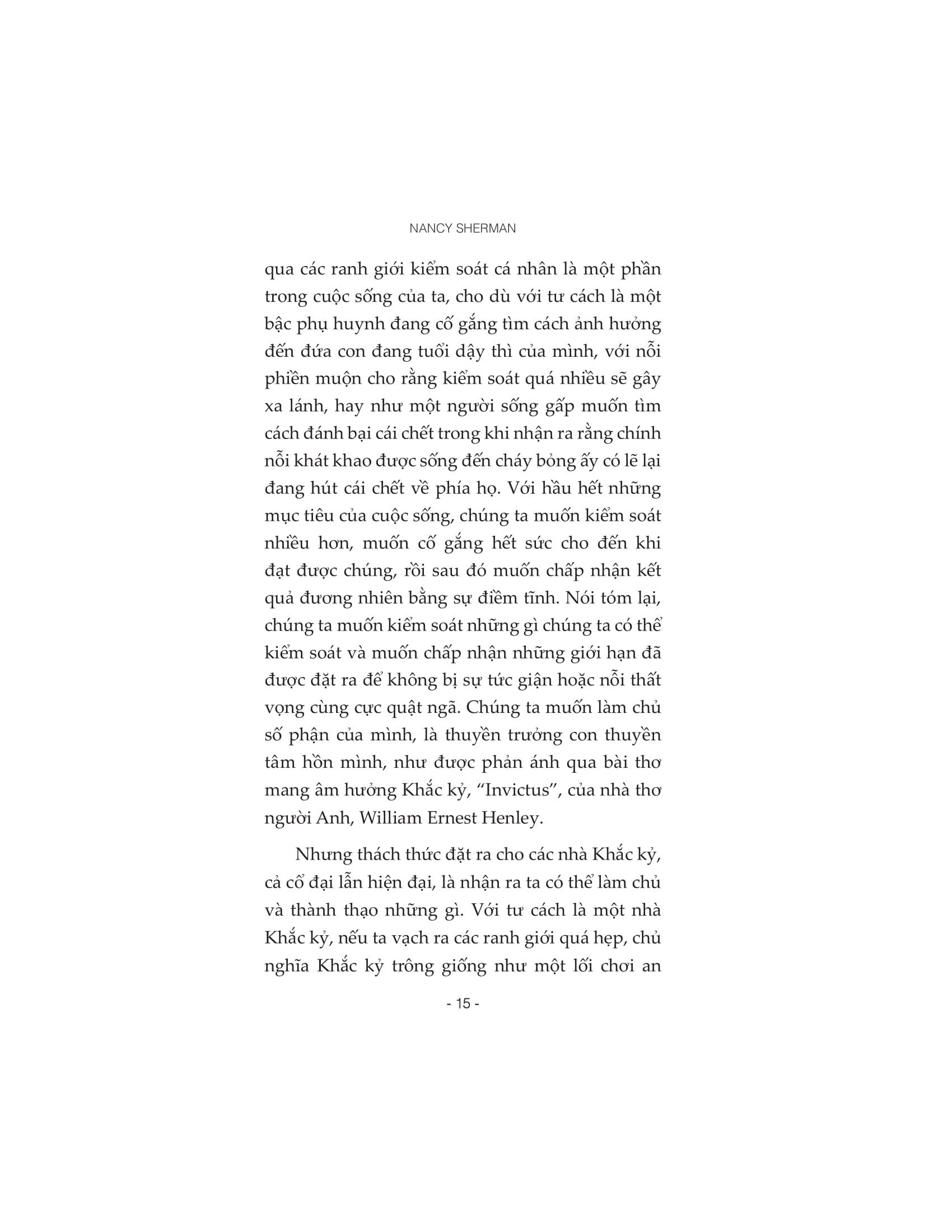 Theo Sherman, chủ nghĩa Khắc kỷ không chỉ là việc kìm nén cảm xúc hay chịu đựng khó khăn một cách cô độc, mà nó tập trung vào việc nuôi dưỡng trí tuệ, xây dựng cộng đồng và duy trì trách nhiệm đạo đức. Cuốn sách trình bày những nguyên tắc cốt lõi của chủ nghĩa Khắc kỷ, ví dụ như con người cần hiểu rõ điều gì nằm trong tầm kiểm soát của m.ình, thực hành chánh niệm và tu dưỡng phẩm hạnh.