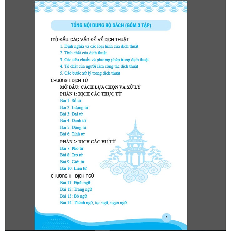 CHƯƠNG I đến CHƯƠNG V được biên soạn có độ khó tăng dần, lần lượt phát triển theo thứ tự; (a) dịch từ; (b) dịch cụm từ; (c) dịch câu ngắn; (d) dịch câu dài; (e) dịch đoạn; (f) dịch bài thông qua các chủ đề phong phú, các lĩnh vực