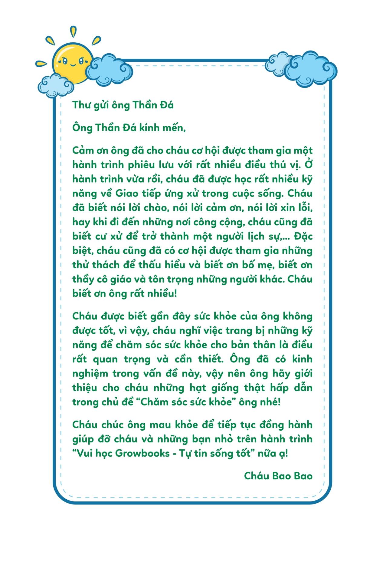mỗi trang sách là một bước chân giúp các em tiến gần hơn đến việc trở thành người bạn thân thiết của chính cơ thể m.ình. ngoài việc học để biết, cuốn sách còn giúp các em thực hành và hình thành thói quen sống lành mạnh, từ đó nuôi dưỡng sự tự tin, khả năng tự chăm sóc và ý thức giữ gìn sức khỏe ngay từ khi còn nhỏ.