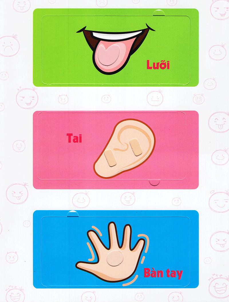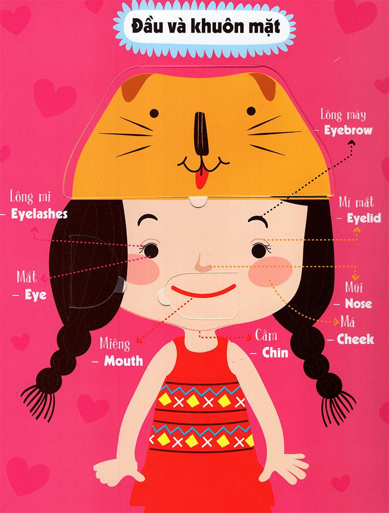Bố mẹ và bé hãy mở cuốn sách này ra rồi lật những miếng ghép lên để cùng học rất nhiều từ song ngữ Việt – Anh về cơ thể người nhé!