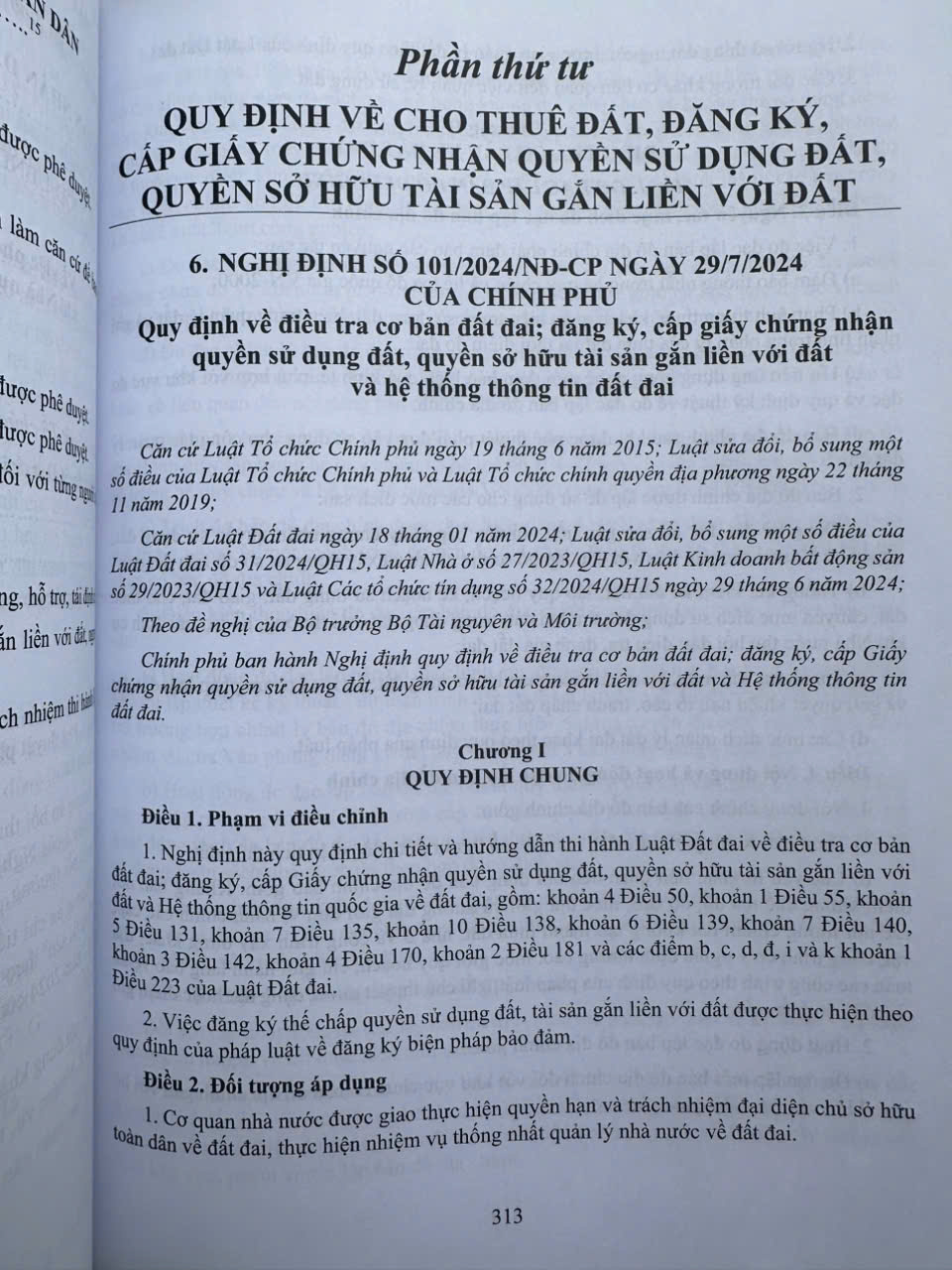 – Nghị định 101/2024/NĐ-CP ngày 29/7/2024 Quy định về điều tra cơ bản đất đai; đăng ký, cấp giấy chứng nhận quyền sử dụng đất, quyền sở hữu tài sản gắn liền với đất và hệ thống thông tin đất đai