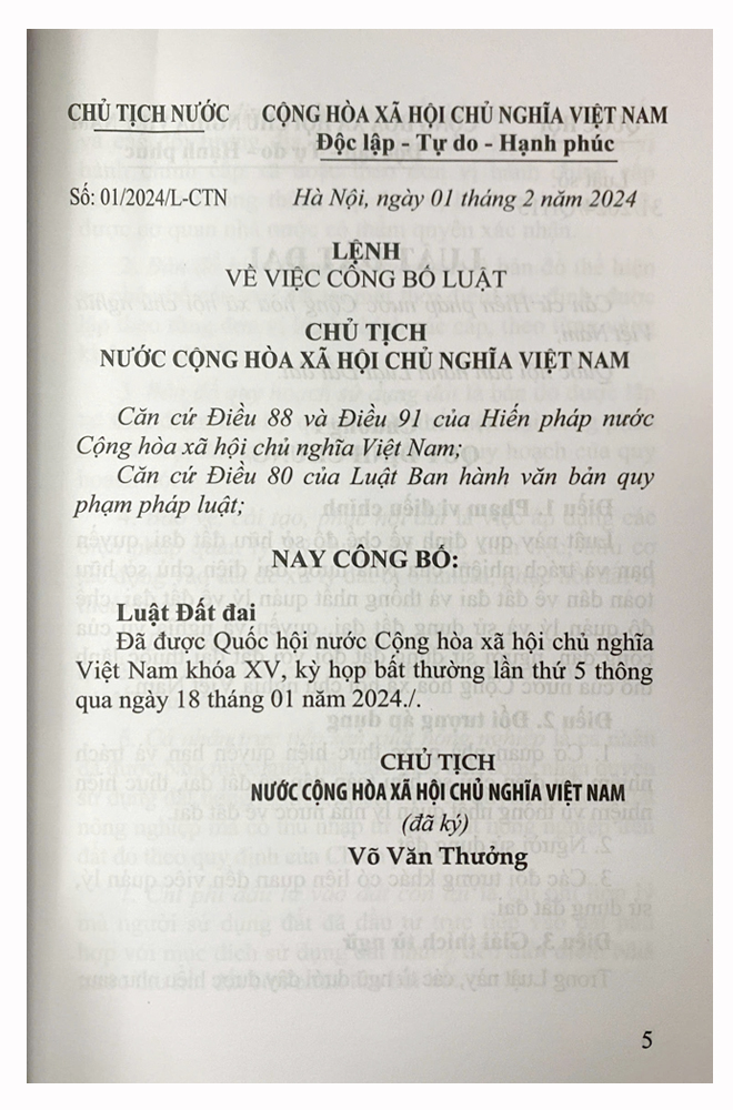 Luật Đất đai số 31/2024/QH15 được Quốc hội nước Cộng hòa xã hội chủ nghĩa Việt Nam khóa XV, kỳ họp bất thường lần thứ năm thông qua ngày 18 tháng 01 năm 2024,