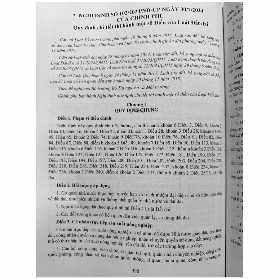 - Toàn bộ sách bìa mềm khổ lớn 20 x 28 cm phân phối bởi Nhà sách Nam Việt đều được bọc sách Plastic MIỄN PHÍ và xuất hóa đơn điện tử đầy đủ, nhanh chóng. …//… Lời giới thiệu: Luật Đất đai số 31/2024/QH15 đã được Quốc hội khóa XV thông qua ngày 18/01/2024. Luật Đất đai số 31/2024/QH15 gồm 16 chương, 260 điều, trong đó sửa đổi, bổ sung 180/212 điều của Luật Đất đai năm 2013 và bổ sung mới 78 điều. Để sớm đưa Luật Đất đai vào cuộc sống, phù hợp với chủ trương của Đảng, khắc phục những tồn tại, hạn chế, nhất là trong công tác định giá đất, thu hồi đất, bồi thường, hỗ trợ tái định cư, ngày 29/6/2024 Quốc hội đã thông qua Luật sửa đổi, bổ sung một số điều của Luật Đất đai số 31/2024/QH15, Luật Nhà ở số 27/2023/QH15, Luật Kinh doanh bất động sản số 29/2023/QH15, Luật Các tổ chức tín dụng số 32/2024/QH15. Ngoài ra trong sách đã cập nhật các Nghị định mới trong năm 2024 như sau: – Nghị định số 71/2024/NĐ-CP ngày 27/6/2024 Quy định về giá đất – Nghị định số 88/2024/NĐ-CP ngày 15/7/2024 Quy định về bồi thường, hỗ trợ, tái định cư khi nahf nước thu hồi đất – Nghị định 101/2024/NĐ-CP ngày 29/7/2024 Quy định về điều tra cơ bản đất đai; đăng ký, cấp giấy chứng nhận quyền sử dụng đất, quyền sở hữu tài sản gắn liền với đất và hệ thống thông tin đất đai – Nghị định 102/2024/NĐ-CP ngày 30/7/2024 Quy định chi tiết thi hành một số điều của Luật Đất đai – Nghị định 103/2024/NĐ-CP ngày 30/7/2024 Quy định về tiền sử dụng đất, tiền thuê đất – Nghị định 104/2024/NĐ-CP ngày 31/7/2024 Quy định quỹ phát triển đất