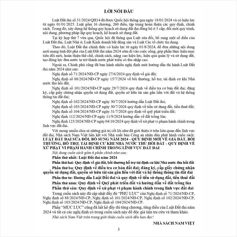 - Toàn bộ sách bìa mềm khổ lớn 20 x 28 cm phân phối bởi Nhà sách Nam Việt đều được bọc sách Plastic MIỄN PHÍ và xuất hóa đơn điện tử đầy đủ, nhanh chóng. …//… Lời giới thiệu: Luật Đất đai số 31/2024/QH14 đã được Quốc hội thông qua ngày 18/01/2024 và có hiệu lực từ ngày 01/01/2025. Luật gồm 16 chương, 260 điều, tập trung hoàn thiện các quy định, chính sách. Trong đó, xây dựng hệ thống quy hoạch sử dụng đất đai đồng bộ ở 3 cấp; đổi mới quy trình, nội dung, phương pháp lập quy hoạch, kế hoạch sử dụng đất. Tại kỳ họp thứ 7 vừa qua, Quốc hội đã thông qua Luật sửa đổi, bổ sung một số điều của Luật Đất đai, Luật Nhà ở, Luật Kinh doanh bất động sản và Luật Các tổ chức tín dụng. Theo đó, Luật Đất đai chính thức có hiệu lực từ ngày 01/8/2024, để đưa những nội dung mới mang tính đột phá của Luật Đất đai năm 2024 sớm đi vào cuộc sống, góp phần thực hiện mục tiêu đổi mới, hoàn thiện thể chế, chính sách, nâng cao hiệu lực, hiệu quả quản lý và sử dụng đất, tạo động lực đưa nước ta trở thành nước phát triển có thu nhập cao. Ngoài ra, Chính phủ cũng đã ban hành nhiều nghị định mới hướng dẫn thi hành Luật Đất đai năm 2024 như sau: Nghị định số 71/2024/NĐ-CP ngày 27/6/2024 quy định về giá đất; Nghị định số 88/2024/NĐ-CP ngày 15/7/2024 về bồi thường, hỗ trợ, tái định cư khi Nhà nước thu hồi đất; Nghị định số 101/2024/NĐ-CP ngày 29/7/2024 quy định về điều tra cơ bản đất đai; đăng ký, cấp giấy chứng nhận quyền sử dụng đất, quyền sở hữu tài sản gắn liền với đất và hệ thống thông tin đất đai; Nghị định số 102/2024/NĐ-CP ngày 30/7/2024 hướng dẫn Luật Đất đai; Nghị định số 103/2024/NĐ-CP ngày 30/7/2024 quy định về tiền sử dụng đất, tiền thuê đất; Nghị định số 104/2024/NĐ-CP ngày 31/7/2024 quy định về quỹ phát triển đất; Nghị định 112/2024/NĐ-CP ngày 11/9/2024 hướng dẫn về đất trồng lúa; Nghị định 123/2024/NĐ-CP ngày 04/10/2024 quy định về xử phạt vi phạm hành chính trong lĩnh vực đất đai. Với mong muốn chia sẻ những giá trị cốt lõi như đã giới thiệu ở trên liên quan đến lĩnh vực đất đai, Nhà sách Nam Việt liên kết với Nhà xuất bản Công an nhân dân phát hành cuốn sách: LUẬT ĐẤT ĐAI SỬA ĐỔI, BỔ SUNG NĂM 2024 – QUY ĐỊNH MỚI VỀ GIÁ ĐẤT, BỒI THƯỜNG, HỖ TRỢ, TÁI ĐỊNH CƯ KHI NHÀ NƯỚC THU HỒI ĐẤT – QUY ĐỊNH VỀ XỬ PHẠT VI PHẠM HÀNH CHÍNH TRONG LĨNH VỰC ĐẤT ĐAI …//… Nội dung cuốn sách gồm 6 phần chính như sau: Phần thứ nhất: Luật Đất đai năm 2024 Phần thứ hai: Quy định về giá đất, bồi thường hỗ trợ tái định cư khi Nhà nước thu hồi đất Phần thứ ba: Quy định về điều tra cơ bản đất đai; đăng ký, cấp giấy chứng nhận quyền sử dụng đất, quyền sở hữu tài sản gắn liền với đất và hệ thống thông tin đất đai Phần thư tư: Hướng dẫn Luật Đất đai và quy định về tiền sử dụng đất, tiền thuê đất Phần thứ năm: Quy định về Quỹ phát triển đất và hướng dẫn về đất trồng lúa Phần thứ sáu: Quy định về xử phạt vi phạm hành chính trong lĩnh vực đất đai Trong cuốn sách này đã cập nhật đầy đủ “PHỤ LỤC” của Nghị định số 71/2024/NĐ-CP, Nghị định số 88/2024/NĐ-CP, Nghị định số 101/2024/NĐ-CP, Nghị định số 102/2024/NĐ-CP, Nghị định số 103/2024/NĐ-CP, Nghị định số 104/2024/NĐ-CP. Phần “MỤC LỤC” cũng đã liệt kê đầy đủ từng chương, từng điều của Luật Đất đai năm 2024 và tất cả các nghị định có trong cuốn sách này để độc giả tiện tra cứu và tham khảo. Nhà sách Nam Việt trân trọng giới thiệu cuốn sách đến bạn đọc! *** Quý khách hàng hãy an tâm khi mua sách tại Nhà sách Nam Việt, cam kết uy tín, chất lượng, sách bản gốc chuẩn đẹp, được kiểm hàng, hài lòng mới thanh toán, sách đã được bọc plastic cao cấp miễn phí! …//… Cảm ơn các bạn đã ghé thăm shop Nhà sách Nam Việt ! Sách Luật Đất Đai sửa đổi, bổ sung năm 2024 – Quy Định Mới Về Giá Đất, Bồi Thường, Hỗ Trợ, Tái Định Cư Khi Nhà Nước Thu Hồi Đất – Quy Định Về Xử Phạt Vi Phạm Hành Chính Trong Lĩnh Vực Đất Đai Sách Luật Đất Đai sửa đổi, bổ sung năm 2024 – Quy Định Mới Về Giá Đất, Bồi Thường, Hỗ Trợ, Tái Định Cư Khi Nhà Nước Thu Hồi Đất – Quy Định Về Xử Phạt Vi Phạm Hành Chính Trong Lĩnh Vực Đất Đai