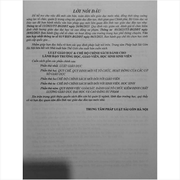 - Văn bản hợp nhất thông tư số 01/VBHN-BGDĐT ngày 06/3/2023, Ban hành quy chế thi chọn học sinh giỏi cấp quốc gia…. Nhằm phổ biến đến Quý Cơ quan, Đơn vị và Quý khách hàng thân thiết nắm bắt kịp thời những quy định mới nêu trên. Nhà sách Nam Việt xin trân trọng giới thiệu cuốn sách: Luật Giáo Dục - Chế Độ Chính sách Dành Cho Lãnh Đạo Trường Học, Giáo Viên, Học Sinh Sinh Viên …/… Cuốn sách gồm các phần sau: Phần thứ nhất. LUẬT GIÁO DỤC Phần thứ hai. QUY CHẾ, QUY ĐỊNH MỚI VỀ TỔ CHỨC, HOẠT ĐỘNG CỦA CÁC CƠ SỞ GIÁO DỤC Phần thứ ba. CHẾ ĐỘ CHÍNH SÁCH MỚI ĐỐI VỚI GIÁO VIÊN Phần thứ tư. CHẾ ĐỘ CHÍNH SÁCH MỚI ĐỐI VỚI SINH VIÊN, HỌC SINH Phần thứ năm. QUY ĐỊNH VIỆC GIÁM SÁT, ĐÁNH GIÁ TỔ CHỨC KIỂM ĐỊNH CHẤT LƯỢNG GIÁO DỤC ĐẠI HỌC VÀ CAO ĐẲNG SƯ PHẠM Cảm ơn các bạn đã ghé thăm shop Nhà sách Nam Việt ! Sách Luật Giáo Dục - Chế Độ Chính sách Dành Cho Lãnh Đạo Trường Học, Giáo Viên, Học Sinh Sinh Viên Sách Luật Giáo Dục - Chế Độ Chính sách Dành Cho Lãnh Đạo Trường Học, Giáo Viên, Học Sinh Sinh Viên