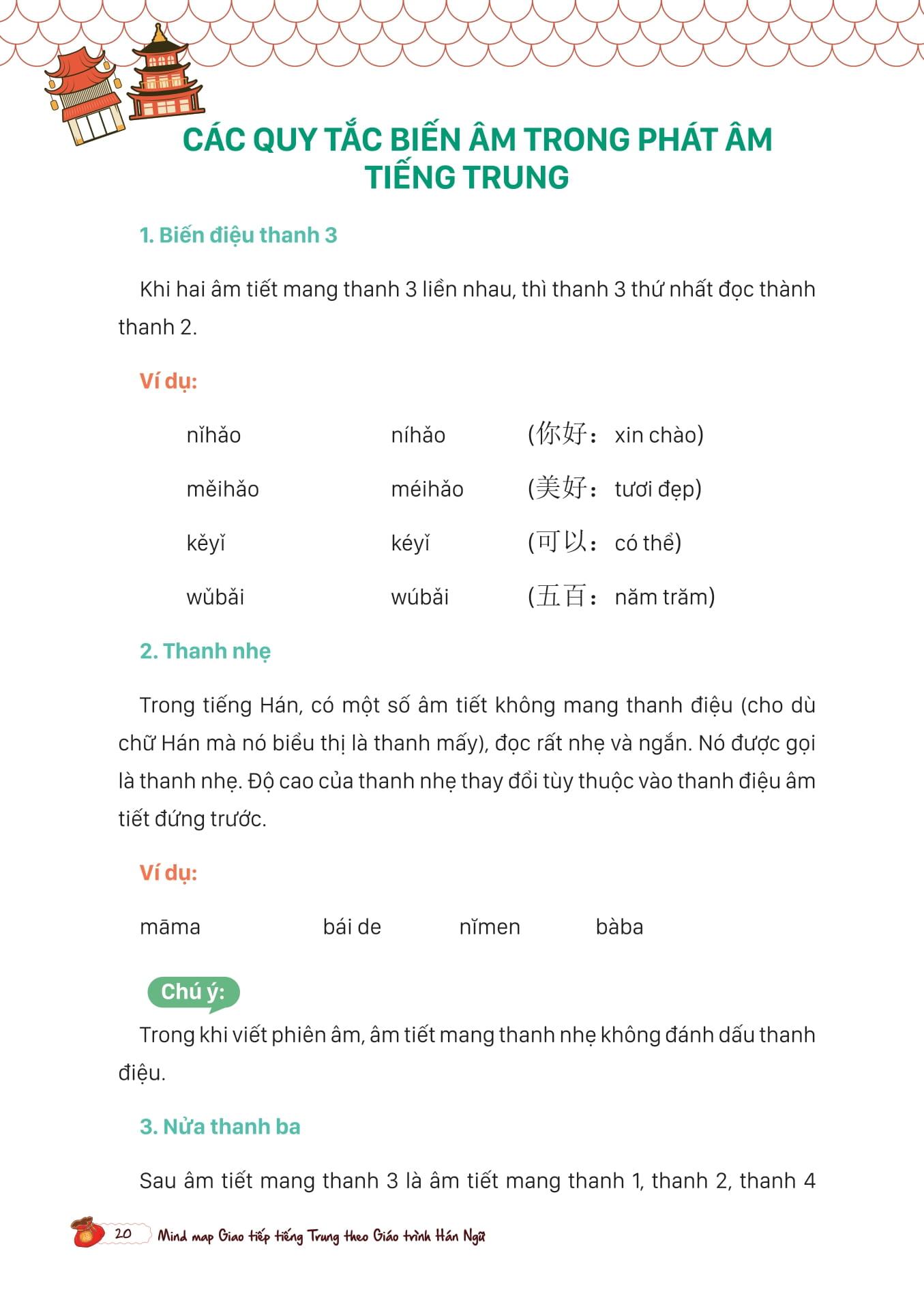 - Vốn từ vựng và ngữ pháp: Cung cấp một lượng từ vựng và ngữ pháp phong phú, giúp người học nắm vững ngữ pháp và sử dụng từ vựng chính xác trong giao tiếp Giáo trình Hán ngữ là bộ sách học tiếng Trung phổ biến và hiệu quả hàng đầu, nhưng nhiều người học vẫn gặp khó khăn trong việc ứng dụng kiến thức vào giao tiếp thực tế. Mind Map Giao Tiếp Tiếng Trung Theo Giáo Trình Hán Ngữ là cuốn sách do MCBooks phát hành giúp người học giải quyết vấn đề này. Cuốn sách sử dụng phương pháp sơ đồ tư duy (mind map) để hệ thống hóa các tình huống giao tiếp và từ vựng, giúp người học dễ dàng ghi nhớ và áp dụng kiến thức vào các cuộc trò chuyện hàng ngày. Nhờ đó, người học tự tin hơn khi sử dụng ngôn ngữ này trong cuộc sống. Nội dung chính trong sách Cuốn sách được chia thành các phần như sau: Bài mở đầu: Phát âm Phần này cung cấp nền tảng về cách phát âm tiếng Trung, bao gồm các thanh mẫu, vận mẫu, thanh điệu và quy tắc biến âm. Đây là bước đầu tiên và rất quan trọng giúp người học làm quen với âm điệu và cách phát âm chuẩn của tiếng Trung. 12 chủ đề thông dụng trong cuộc sống Mỗi chủ đề được chia thành các bài học nhỏ dựa trên các ngữ cảnh khác nhau, như: