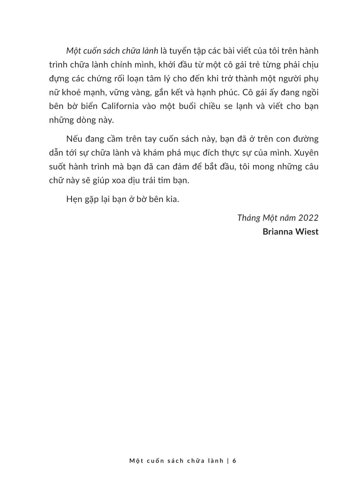 “Một cuốn sách chữa lành” là tuyển tập các ghi chép trên hành trình chữa lành của tác giả Brianna, từ một cô gái trẻ đầy tổn thương học cách vượt qua những biến cố, hàn gắn từng mảnh vỡ trong tâm hồn để trở thành người phụ nữ vững vàng và hạnh phúc trong hiện tại.