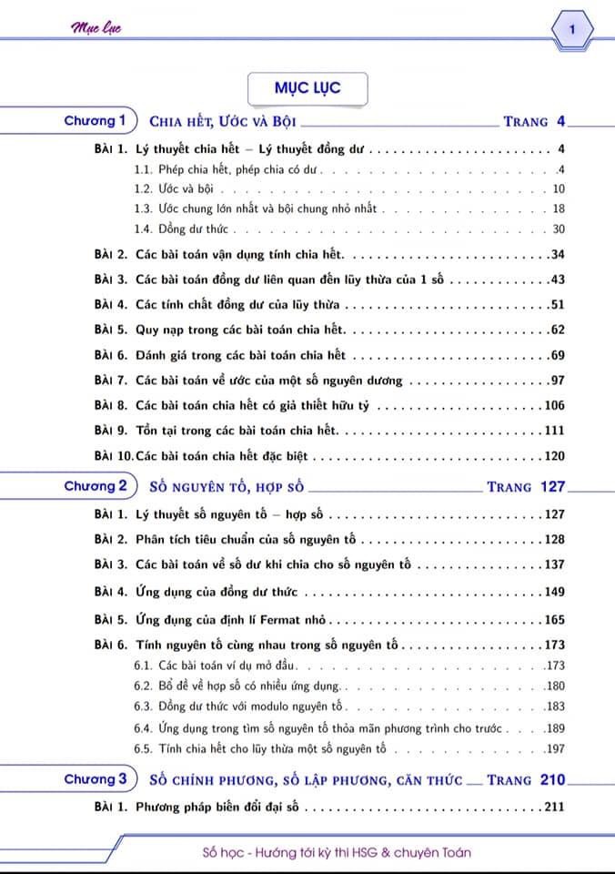 Chương 1 : Chia hết, Ước và bộ Chương 2 : Số nguyên Tố, hợp số Chương 3 : Số Chính Phương, Số Lập phương, căn thức Chương 4 : Phương Trình Nghiệm nguyên Chương 5 : Tính chất số học của Đa thức Chương 6: Bất đẳng thức trong Số học Chương 7 : Hàm phần nguyên, phần lẻ Chương 8 : Hàm Tổng chữ số