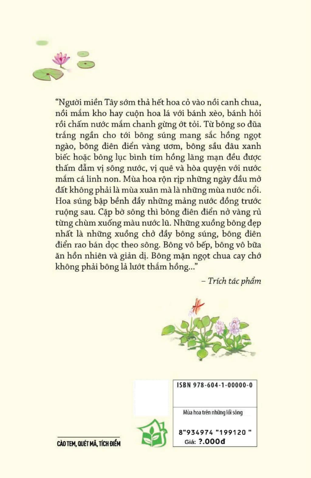 Tập tản văn Mùa hoa trên những lối sông là những cảm xúc da diết của chị về miền Tây Nam bộ. Nơi đó có núi Ba Chúc, có cuộc mưu sinh nhọc nhằn, có tình người chân chất, có con nước uốn lượn - “Tôi thèm những con nước chảy về từ ký ức. Có nhiều lúc ngồi viết, tôi muốn dẫn một dòng nước chạy ngang bàn viết của m.ình. Một dòng nước có g.ấp khúc, có uốn lượn để tôi nghe được tiếng nước đang trăn trở đâu đó bên tai. Tôi thèm đến độ ngủ chiêm bao thấy được những trưa ngồi trên cầu thang nhà lượm những miếng lưới rách để giăng chơi mà gỡ được những con cá linh vảy bạc nhảy soi sói. Giấc mơ xa xỉ nhất trong đời”. Nơi đó cũng rực rỡ những mùa hoa – “Từ bông so đũa trắng ngần cho tới bông s.úng mang sắc hồng ngọt ngào, bông điên điển vàng ươm, bông sầu đâu xanh biếc hoặc bông lục bình tím hồng lãng mạn đều được thấm đẫm vị sông nước, vị quê và hòa quyện với nước mắm cá linh non”.