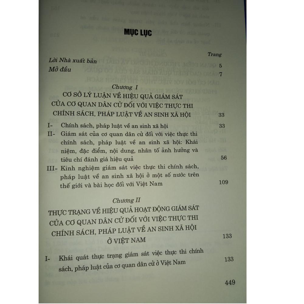 Trên cơ sở đánh giá thực trạng giám sát của Quốc hội và hội đồng nhân dân đối với việc thực thi chính sách, pháp luật về an sinh xã hội hiện nay, các tác giả đề xuất quan điểm, phương pháp và các giải pháp nhằm nâng cao hiệu quả giám sát của cơ quan dân cử đối với việc thực thi chính sách, pháp luật về an sinh xã hội ở nước ta những năm tới. Nội dung chính của cuốn sách gồm ba chương: