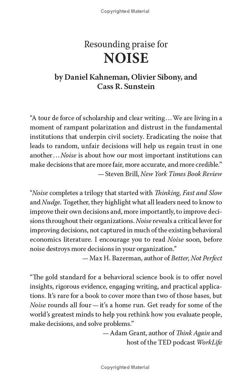 Packed with original ideas, and offering the same kinds of research-based insights that made Thinking, Fast and Slow and Nudge groundbreaking New York Times bestsellers, Noise explains how and why humans are so susceptible to noise in judgment--and what we can do about it.