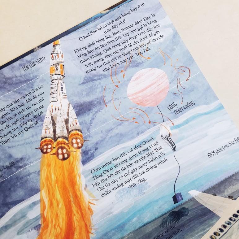 “Bầu trời vời vợi” đưa bé du hành lên bầu trời bao la. Bầu trời tưởng như trống trải, chẳng có gì ngoài mây nhỉ! Chưa chắc đâu bé ơi, mây cũng có rất nhiều loại, bầu trời còn có những loài chim bay lượn, các phương tiện như máy bay, tàu vũ trụ. Và bé sẽ biết được, bầu trời trong xanh là thế nhưng nếu ta cứ đi lên mãi thì sẽ không còn màu xanh trời nữa. Vì sao nhỉ? Bé hãy cùng tìm hiểu nha!