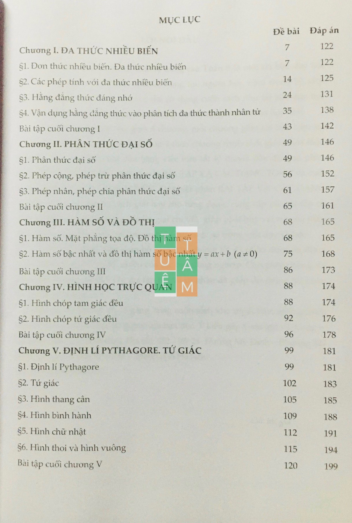 Mua tại TiktokNhà sách Tuệ Tâm trân trọng giới thiệu bộ sách: Ôn luyện cơ bản và nâng cao Toán 8 (Cánh diều)! NỘI DUNG SÁCH Chương 1: Đa thức nhiều biến Chương 2: Phân thức đại số Chương 3: Hàm số và đồ thị Chương 4: Hình học trực quan Chương 5: Định lí Pythagore. Tứ giác Chương 6: Một số yếu tố thống kê và xác suất Chương 7: Phương trình bậc nhất một ẩn Chương 8: Tam giác đồng dạng. Hình đồng dạng