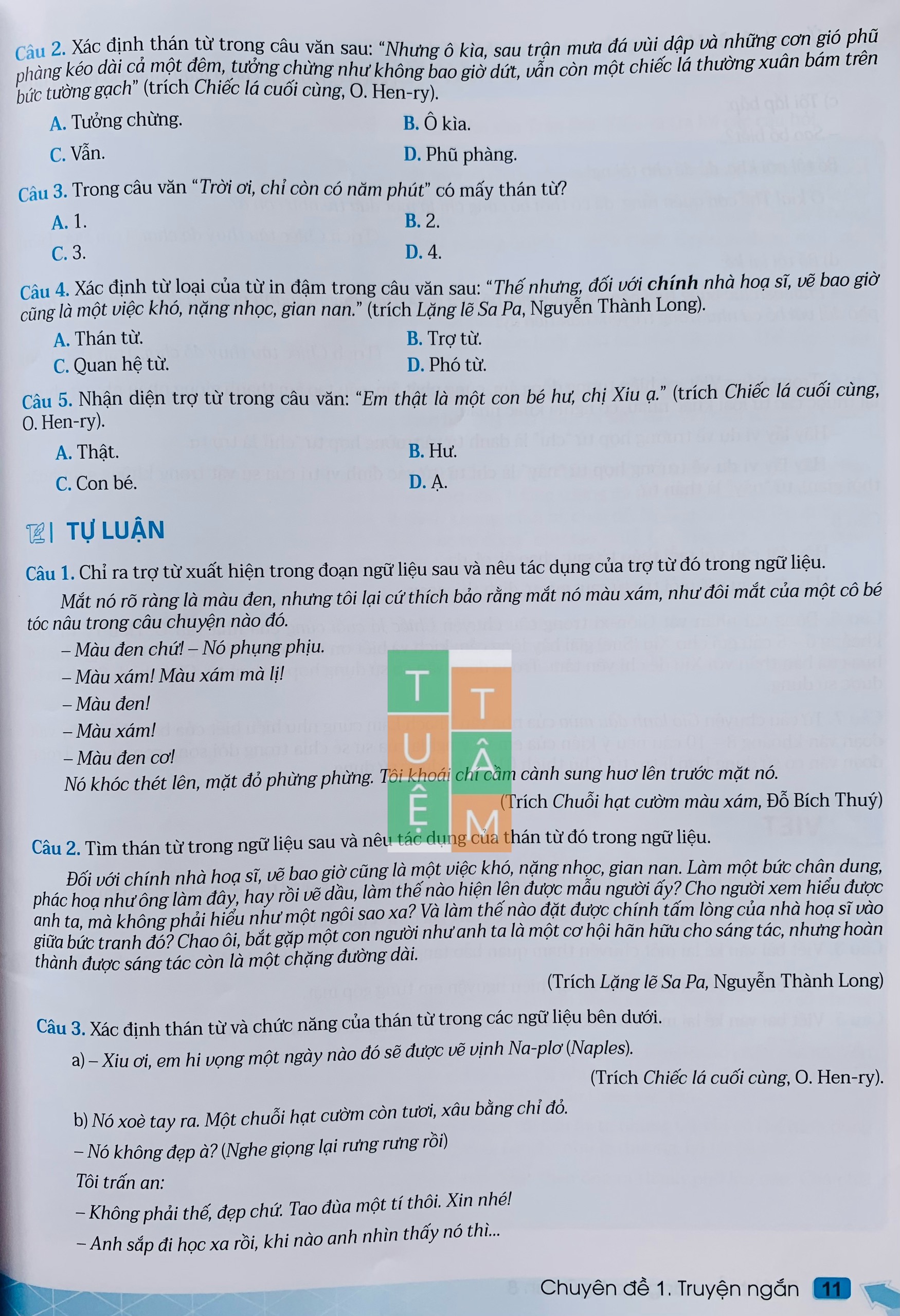 Thứ nhất, phần đọc gồm các bài tập trắc nghiệm và tự luận về các kiến thức văn bản, tiếng Việt.