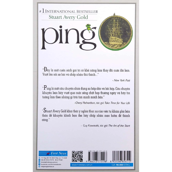 Ping - Vượt Ao Tù Ra Biển Lớn - Bạn có thể tạo ra những cú nhảy tuyệt diệu từ nội lực cửa chính mình Sau sự thành công của Ping - Vượt khỏi ao tù (tập 1), Ping – Hành trình ra biển lớn(tập 2), First News đã nhận được rất nhiều ý kiến hồi âm từ bạn đọc, đặc biệt là các bạn trẻ về nội dung và hình thức của hai cuốn sách vô cùng ý nghĩa và sâu sắc này. Điều đặc biệt mà cuốn sách mang đến cho bạn đọc thấy được là có bóng dáng mình trong từng trang sách, được trải nghiệm thú vị cùng với những cuộc hành trình của chú ếch Ping. Cảm nhận được điều đó bạn đọc biết trân trọng quá khứ, tiếp sinh lực cho hiện tại, từ đó định hướng tương lai một cách sâu sắc và đầy nghị lực, tạo ra bước nhảy vọt cho chính mình. Ping sẽ giúp bạn nhìn lại, hiểu hơn về những năng lực của bản thân và rút ra bài học để bạn bước tiếp:"hãy sống một cuộc sống đầy sôi động và say mê, thông qua sự nhận ra bản chất thật sự và những tiềm năng bất tận của bản thân".Ngoài những lời khen của bạn đọc yêu mến, cuốn sách còn thể hiện tính giáo dục triết lý, nhân văn và lành mạnh, ẩn sâu sau mỗi câu chuyện của chú ếch tí hon đáng yêu và nghộ nghĩnh. Để tiếp nối cho sự thành công đó First News đã quyết định kết hợp hai tập "Ping - Vượt khỏi ao tù" và Ping – Hành trình ra biển lớn thành một cuốn. Cuốn sách “Ping - Vượt Ao Tù Ra Biển Lớn” mới hơn về cách trình bày giúp các bạn đọc có mạch cảm hứng liên tục, qua đó dễ dàng cảm nhận, đưa hồn vào cùng trang sách, cùng trải nghiệm với những cuộc hành trình xuyên suốt của chú ếch Ping và những người bạn.Với tài nhảy xa vô địch thiên hạ của mình, chú ếch Ping có đủ lý do để tự cao, tự mãn, để rồi cuối cùng lại bị chính sức ì của thói xấu ấy kìm kẹp. Nếu mạch truyện phát triển theo hướng đó, ta có thể hình dung đoạn kết sẽ là những bài học lý lẽ khô khan bàn về sự trả giá cho thói kiêu ngạo, bảo thủ, về sự hối hận muộn màng của Ping. Với những câu chuyện hấp dẫn này, Stuart Avery Gold dẫn dắt bạn đọc vào một chuyến phiêu lưu cực kỳ thú vị cùng chú ếch Ping nhằm tìm kiếm sự thay đổi, thay đổi từ chính nội tâm mình. "Cuộc hành trình có ý nghĩa nhất chính là cuộc hành trình bên trong mỗi chúng ta", để có thể vững bước trên hành trình ấy, Ping cần đến sự giúp đỡ của một bác Cú thông thái. Từ đây, hai bác cháu Cú và Ếch cùng trải qua chặng đường gian nan để tôi luyện tinh thần, vượt lên thử thách nhằm tìm ra con đường minh triết – con đường SỐNG CÓ CHỦ ĐÍCH - giữa cuộc đời, nơi mỗi cá thể có thể nắm giữ vận mệnh của chính mình thông qua quá trình TRI NGỘ. Sau chuyến hành trình đầu tiên, vượt khỏi ao tù thành công, đến hành trình thứ hai Ping thực hiện một cuộc phiêu lưu mới – cuộc hành hương ra biển lớn với hai chú ếch trẻ là Daikon và Hodo. Lúc này đây, Ping giữ vai trò người thầy, người anh đi trước dẫn đường, hướng dẫn và truyền lại kinh nghiệm cho các đàn em. Để rồi cái đích của cuộc hành trình ấy là đại dương mênh mông, rộng lớn và hơn thế nữa là tư duy "dám nghĩ dám làm" và sự tự tin vào bản thân của hai chú ếch trẻ. Khép lại với hai cuộc hành trình thú vị của chú ếch Ping chúng ta có thể nhận thấy được rằng câu chuyện không chỉ là sự khôi hài, thông minh, tính uyên bác, trong cả việc xây dựng cốt truyện lẫn gợi mở những bài học tinh thần có giá trị. Mà cuốn sách còn gửi gắm đến độc giả trẻ thông điệp về cách sống một cuộc đời tốt nhất - cuộc đời mà từ sâu thẳm tâm hồn bạn luôn khao khát, có thể đạt được thông qua một cuộc sống biết chọn lựa và dám hành động. Có như vậy bạn mới đạt được một đời sống đầy sôi động và say mê, thông qua sự nhận ra bản chất thật sự và những tiềm năng bất tận của bản thân. Mong rằng Ping – Vượt Ao Tù Ra Biển Lớn sẽ khơi nguồn cảm hứng và giúp bạn thực hiện một cú nhảy vọt bằng những khả năng tuyệt vời của chính bản thân mình. Khi bạn cầm quyển sách này trên tay, chứng tỏ rằng bạn đang mở rộng lòng mình trước những tiềm năng vô hạn của bản thân. Hãy đọc Ping - Vượt Ao Tù Ra Biển Lớn cùng một nụ cười nhẹ nhàng, đấy là cách để bạn thẩm thấu ở mức cao nhất nguồn cảm hứng mà chú ếch Ping mang lại. Và trong khi cùng nhau khám phá ý nghĩa huyền diệu của món quà tuyệt vời này, chúng ta đừng quên một điều rằng: "Trong lúc chúng ta bỏ thời gian chờ đợi hạnh phúc, thì hạnh phúc lại ở ngay bên cạnh ta". Sách được biên dịch từ hai cuốn The Way of Ping- Journey to the Great Ocean – A Frog in Search of a New Pond của tác giả Stuart Avery Gold (Hoa Kỳ).