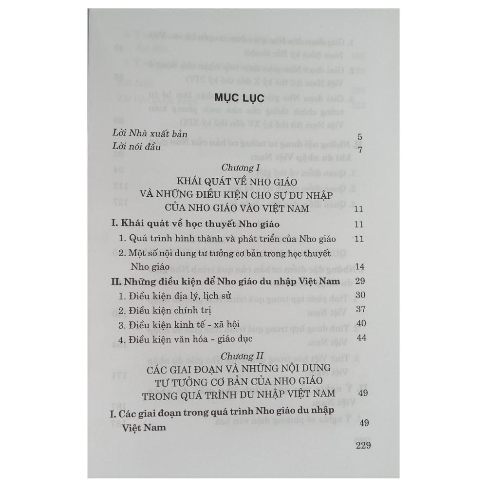 Việt Nam cũng là một nước chịu ảnh hưởng lớn của Nho giáo qua các thời kỳ. Nhằm đáp ứng nhu cầu về tài liệu tham khảo cho những sinh viên, học viên chuyên ngành Triết học, những người quan tâm đến lĩnh vực lịch sử tư tưởng Việt Nam nói riêng và văn hóa Việt Nam nói chung, Nhà xuất bản Chính trị quốc gia Sự thật xuất bản cuốn sách Quá trình du nhập của Nho giáo vào Việt Nam từ đầu Công nguyên đến thế kỷ XIX. Cuốn sách tập trung hệ thống hóa các giai đoạn và tư tưởng của Nho giáo khi du nhập vào Việt Nam từ đầu Công nguyên đến thế kỷ XIX, rút ra những đặc điểm mang tính quy luật của quá trình đó, giúp người đọc thấy được sự thay đổi của Nho giáo dưới sự tác động của quá trình “bản địa hóa”. Trên cơ sở đó nêu bật một số ý nghĩa lịch sử và bài học kinh nghiệm đối với việc kế thừa, tiếp thu có chọn lọc những tinh hoa văn hóa nhân loại nói chung, góp phần vừa làm giàu văn hóa truyền thống dân tộc, vừa giữ gìn bản sắc vốn có và tránh nguy cơ bị đồng hóa trong bối cảnh giao lưu văn hóa đang ngày càng rộng mở của xu thế toàn cầu hóa hiện nay.