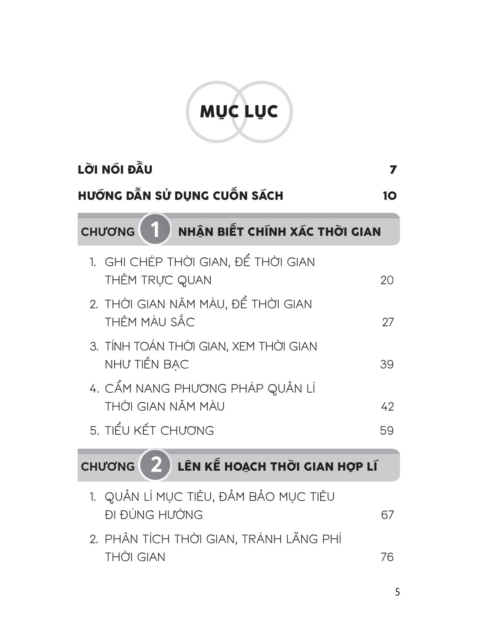 - Có gì trong cuốn sách Quản lí thời gian theo năm màu? Cuốn sách gồm 3 chương, mục đích cuối cùng là sử dụng phương pháp quản lí thời gian năm màu để dễ dàng thiết lập và duy trì những thói quen nhỏ lành mạnh trong cuộc sống. Có 5 cấp độ trong quản lí thời gian: