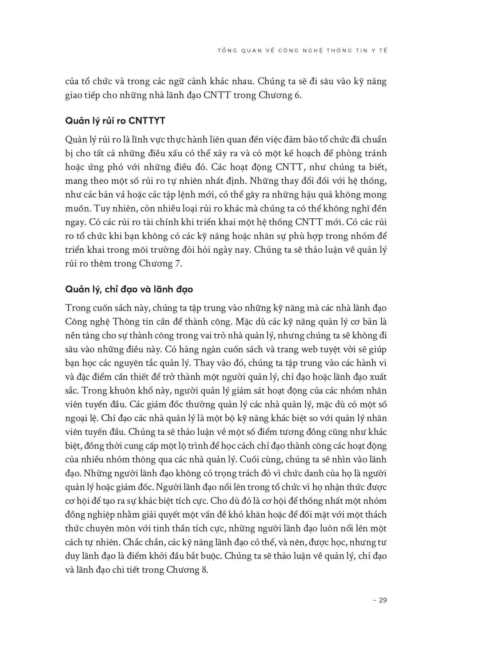 Mua tại TiktokQuản Lý Công Nghệ Thông Tin Trong Y Tế - Chiến Lược, Tầm Nhìn Và Kỹ Năng Trong bối cảnh y tế ngày càng số hóa, công nghệ thông tin y tế (CNTTYT) giữ vai trò trung tâm của hệ thống vận hành. Cuốn sách này là một cẩm nang thực hành cho lãnh đạo CNTT trong ngành y, tập trung không chỉ vào công nghệ mà còn vào kỹ năng lãnh đạo, quản trị và định hướng chiến lược. Tác phẩm bao quát từ nền tảng (chiến lược, quản trị CNTT, tạo giá trị, tiếp thị CNTT y tế) đến các chủ đề nâng cao (quản lý rủi ro, lãnh đạo, Lean IT, đổi mới, y tế số). Đây không chỉ là lý thuyết mà còn cung cấp các khung thực hành, công cụ, kỹ thuật, và case study thực tế để giúp nhà quản lý y tế và CNTT: