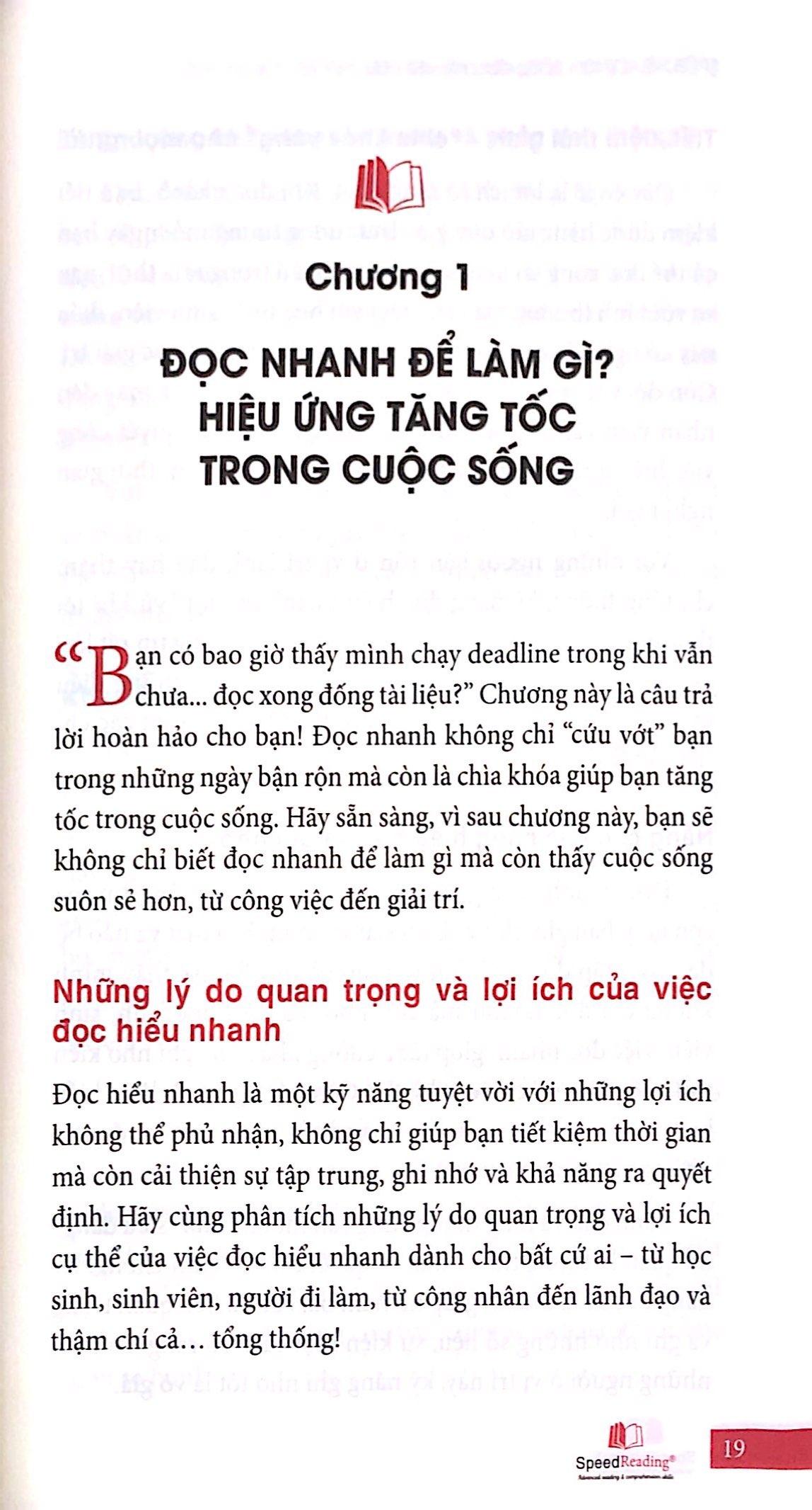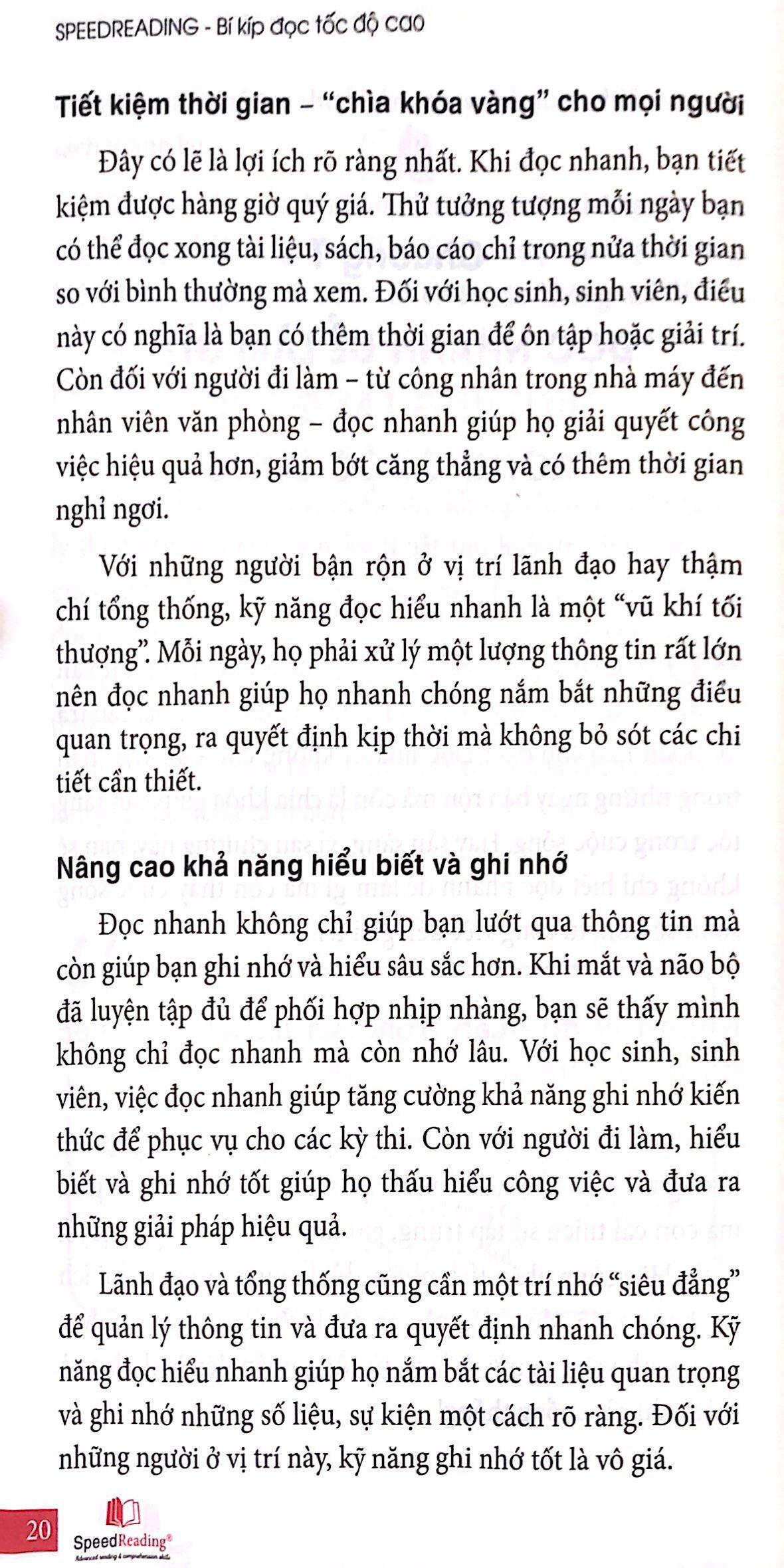 Speedreading - Bí Kíp Đọc Hiểu Tốc Độ Cao Bạn có bao giờ thấy m.ình chạy deadline trong khi vẫn chưa... đọc xong đống tài liệu? Chúng ta đang sống trong thời đại của tốc độ! Mọi thứ đều nhanh hơn, từ xe cộ, mạng internet đến cả nhịp sống hằng ngày. Trong khi đó, lượng thông tin thì cứ thế “bùng nổ” mỗi giây mỗi phút, khiến chúng ta lúc nào cũng phải vật lộn với đống tin tức, , báo cáo, sách vở. Và nếu bạn là một trong những người vẫn còn lề mề từng dòng từng chữ, thì xin chúc mừng, bạn đang tham gia giải đấu “chậm mà chắc... bỏ lỡ cơ hội”! Đây là lý do kỹ năng đọc hiểu nhanh – hay còn gọi là Speed Reading – không chỉ là một lựa chọn mà còn là một “v.ũ khí bí mật” để bạn không bị tụt lại. Đọc nhanh sẽ giúp bạn nắm bắt thông tin kịp thời, xử lý công việc hiệu quả và đặc biệt, nó giống như việc cài thêm “phần mềm tăng tốc” cho bộ não vậy! Bạn sẽ thấy mọi thứ trong cuộc sống của m.ình dần trở nên trôi chảy hơn, suôn sẻ hơn vì bạn có khả năng giải quyết thông tin nhanh gọn, chuẩn xác. Phương pháp Speedreading có từ những năm 1920, nhưng manh nha từ năm 1878 khi bác sĩ nhãn khoa Louis Emile Javal quan sát chuyển động của mắt trong khi đọc. Sau đó là phát minh kỹ năng “dò chữ bằng tay” của giáo viên Evelyn Wood. Kể từ đó, đọc nhanh ngày càng được quan tâm, những người nổi tiếng quan tâm đến có thể kể tới tổng thống John Kennedy, Jimmy Carter… Cuốn sách Speedreading là hướng dẫn chi tiết để bạn từ một người đọc thông thường trở thành “tay đua” tốc độ trong thế giới sách vở. Cuốn sách Speedreading sẽ giúp bạn nhận diện và loại bỏ các chướng ngại đang cản bước bạn đọc nhanh hơn. Bạn sẽ học được những kỹ thuật đã được kiểm nghiệm và áp dụng từ chính những người thành công, và chỉ cần kiên trì, kỹ năng này sẽ đưa bạn tới những thành quả mà bạn chưa từng nghĩ m.ình có thể đạt được. Hãy tạm biệt những thói quen cũ kỹ như đọc thầm, cố định mắt, hay đọc lại, và chuẩn bị cho sự chuyển m.ình ngoạn mục. Với SpeedReading, bạn sẽ không chỉ đọc nhanh hơn mà còn phá bỏ mọi rào cản ngăn bạn chinh phục tri thức!