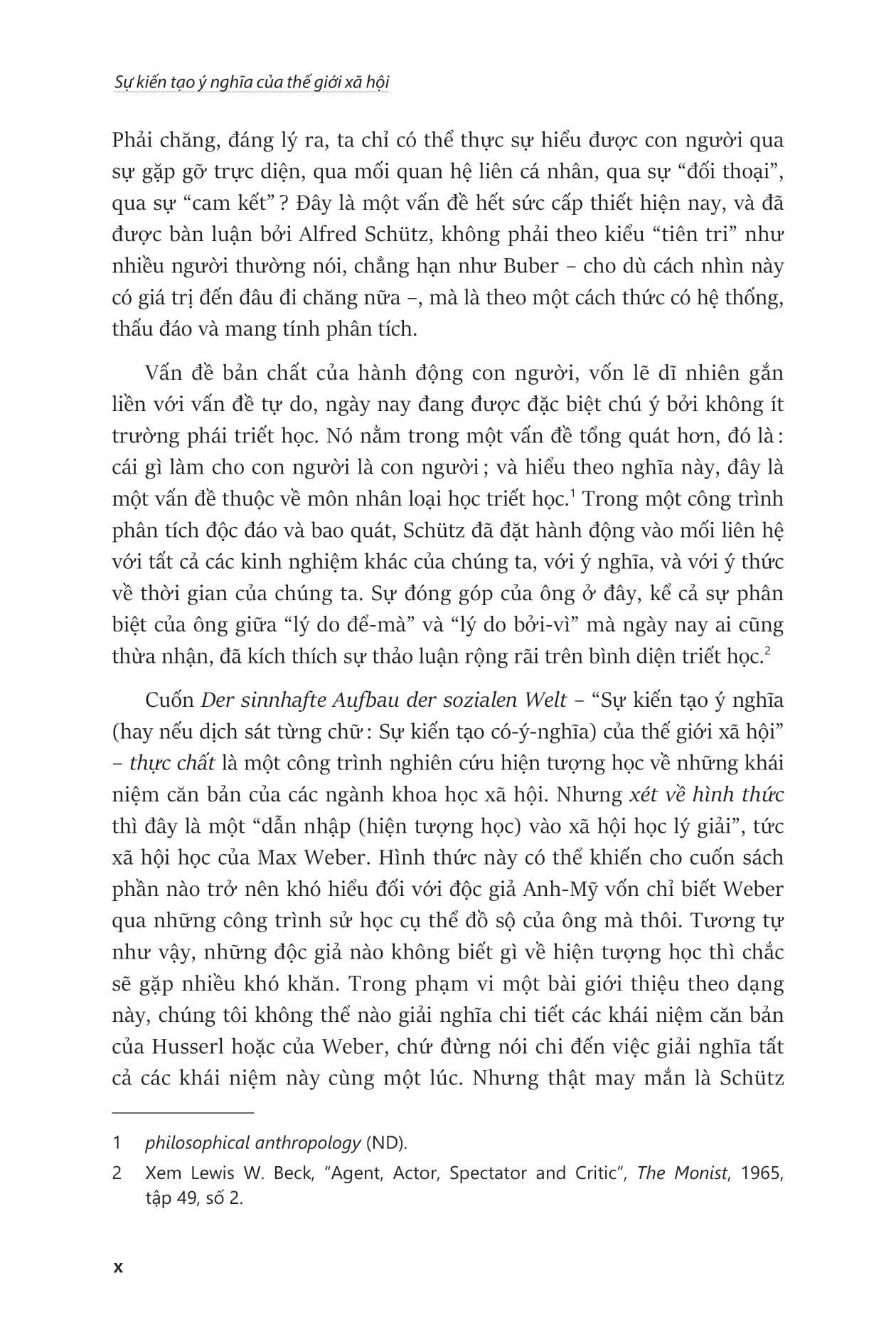 Sự Kiến Tạo Ý Nghĩa Của Thế Giới Xã Hội - Der Sinnhafte Aufbau Der Sozialen Welt Một dẫn nhập vào xã hội học lý giải “Vấn đề mấu chốt của tất cả các ngành khoa học về thế giới xã hội là cấu tạo một bối cảnh ý nghĩa khách quan xuất phát từ những bối cảnh ý nghĩa chủ quan nói chung hoặc từ những bối cảnh ý nghĩa chủ quan cá biệt nào đó. Như vậy, ta có thể tóm tắt vấn đề của bất kỳ ngành khoa học xã hội nào vào câu hỏi sau đây : làm thế nào lại có thể có những ngành khoa học về bối cảnh ý nghĩa chủ quan?” Xuất bản năm 1932, "Sự kiến tạo ý nghĩa của thế giới xã hội" của Alfred Schütz là công trình có tầm ảnh hưởng sâu rộng và lâu dài tới các ngành khoa học xã hội nói chung. Tác phẩm bàn luận chi tiết về hai chủ đề lớn: