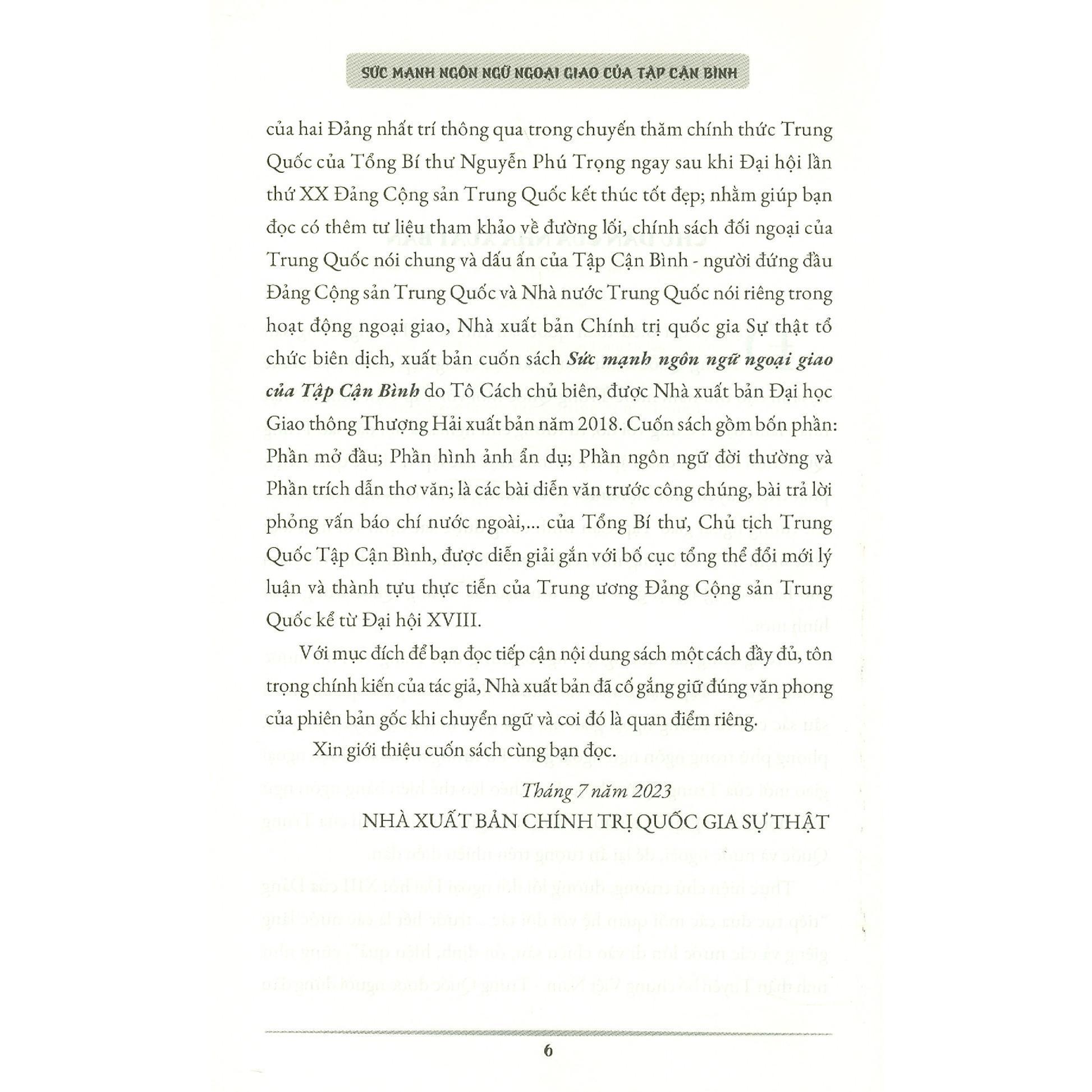 Nhằm giúp bạn đọc có thêm tư liệu tham khảo về đường lối, chính sách đối ngoại của Trung Quốc nói chung và dấu ấn của Tập Cận Bình - người đứng đầu Đảng Cộng sản Trung Quốc và Nhà nước Trung Quốc nói riêng trong hoạt động ngoại giao, Nhà xuất bản Chính trị quốc gia Sự thật tổ chức biên dịch, xuất bản cuốn sáchSức mạnh ngôn ngữ ngoại giao của Tập Cận Bìnhdo Tô Cách chủ biên, được Nhà xuất bản Đại học Giao thông Thượng Hải xuất bản năm 2018.