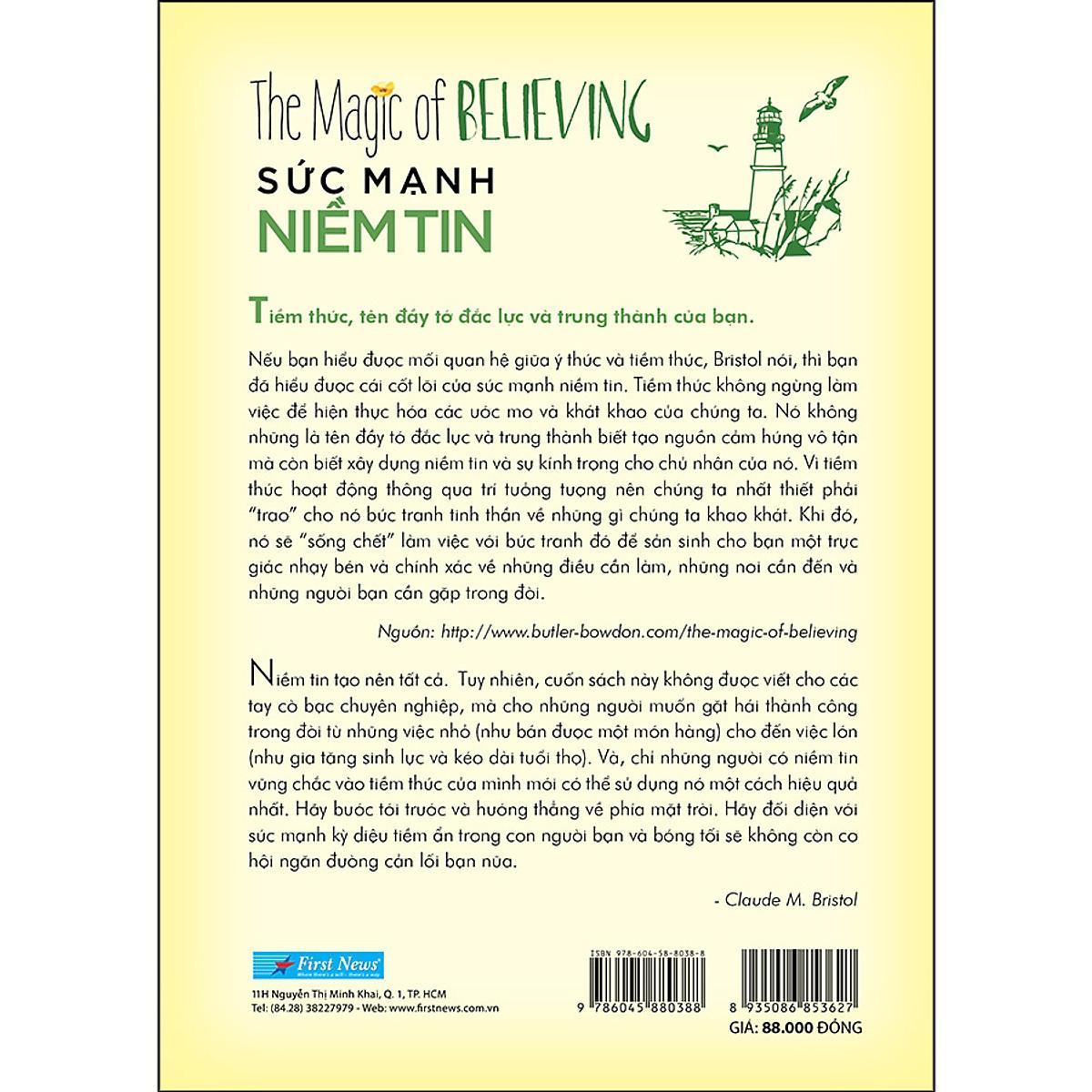 Sức mạnh niềm tin của Claude M. Bristol sẽ mang lại cho bạn đọc sự khích lệ và hỗ trợ mà các bạn đang cần. Nó chỉ ra một cách hết sức đơn giản nhưng đầy thuyết phục rằng phép ám thị luôn luôn có thể được sử dụng để cải thiện hiệu quả của bất kỳ công việc nào. Nó giải phóng mọi tiềm năng và giúp chúng ta tin ở chính mình, đó cũng là một kho bí quyết đầy hiệu quả để phát triển và nuôi dưỡng niềm tin ấy. Chẳng hạn, Bristol kể lại rằng ông thường vẽ nhanh ký hiệu đồng đô-la trên bất cứ mẩu giấy lớn nhỏ nào xuất hiện trên bàn ông. Nghe thật lạ lùng phải không bạn? Vâng, đó không phải là một bài tập luyện trí nhớ, mà là một phương pháp tưởng tượng có tính toán nhằm mục đích gia tăng sức mạnh của niềm tin.