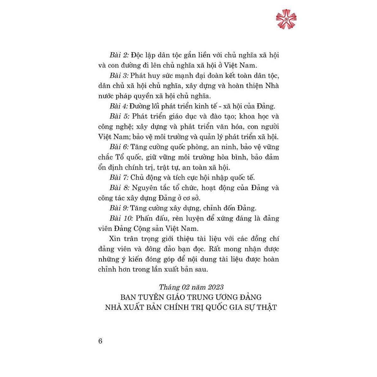 Thực hiện quy định về chế độ học tập lý luận chính trị trong Đảng những năm qua. Ban Tuyên giáo Trung ương Đảng đã biên soạnTài liệu bồi dưỡng lý luận chính trị dành cho đảng viên mới. Để tiếp tục đáp ứng nhu cầu về bồi dường lý luận chính trị cho đảng viên mới theo quy định, sau Đại hội đại biểu toàn quốc lần thứ XIII của Đảng, Ban Tuyên giáo Trung ương đã bổ sung, cập nhật, chỉnh sửa nội dung tài liệu cho phù hợp với các quan điểm, văn bản chỉ đạo mới nhất của Đảng. Nội dung tài liệu trình bày những vấn đề cơ bản về chủ nghĩa Mác - Lênin, tư tương Hồ Chí Minh; đường lối cách mạng Việt Nam; nguyên tắc tổ chức, hoạt động của Đàng và công tác xây dựng Đảng ở cơ sở; nhiệm vụ của đảng viên trong công tác xây dựng, chỉnh đốn Đảng. Mỗi bài học có nội dung thào luận, giúp cho đàng viên mới hệ thống hóa kiến thức lý luận chính trị, xây dựng kế hoạch phấn đấu, rèn luyện để trở thành đảng viên chính thức.