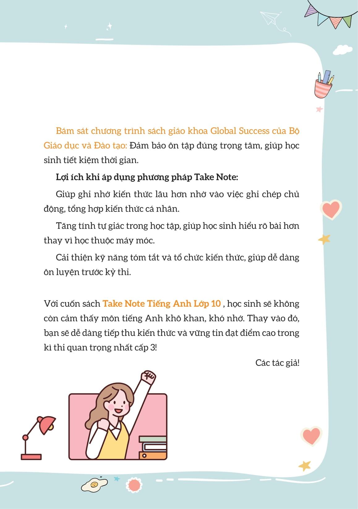 Take Note Tiếng Anh Lớp 10 là cuốn sách được thiết kế đặc biệt dành cho học sinh lớp 10 đang học bộ sách giáo khoa Global Success, nhằm hỗ trợ các bạn trong quá trình học và ôn tập môn tiếng Anh – một trong những môn học được đánh giá là nhiều thử thách, đặc biệt khi chuẩn bị cho kỳ thi THPT Quốc gia.