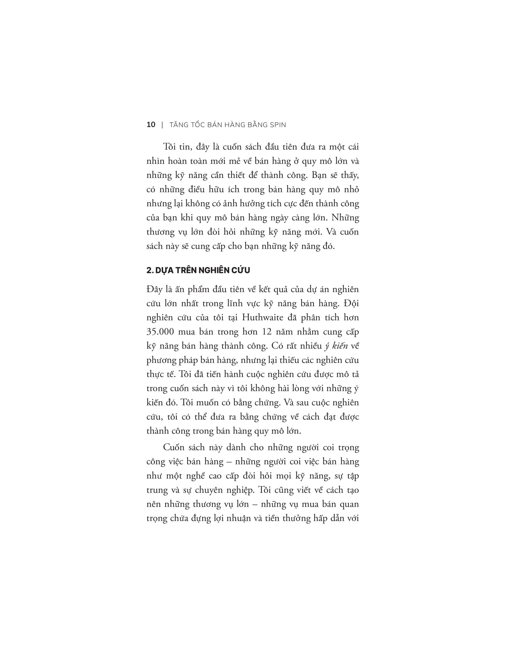 Cuốn sách Tăng tốc bán hàng bằng SPIN của Neil Rackham không phải là lý thuyết sáo rỗng về cách bán hàng mà là những nghiên cứu hết sức khoa học và cụ thể của Huthwaite – công ty chuyên nghiên cứu về phương pháp bán hàng hiệu quả của Neil Rackham.