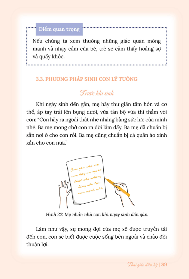 Và hãy nhớ rằng, cơ thể mẹ và bé trong bụng có mối dây liên kết mật thiết. Do đó, những suy nghĩ, cảm xúc của mẹ dù tích cực hay tiêu cực đều được truyền đến con. Ba mẹ hãy nắm rõ những năng lực mà bé sở hữu đã được giới thiệu trong cuốn sách này và tạo ra thật nhiều kích thích cho trẻ từ khi trẻ còn trong bụng mẹ. Những kích thích, tác động từ gia đình và đặc biệt là từ người mẹ sẽ nuôi dưỡng tâm hồn trẻ, phát triển trí não thông minh.