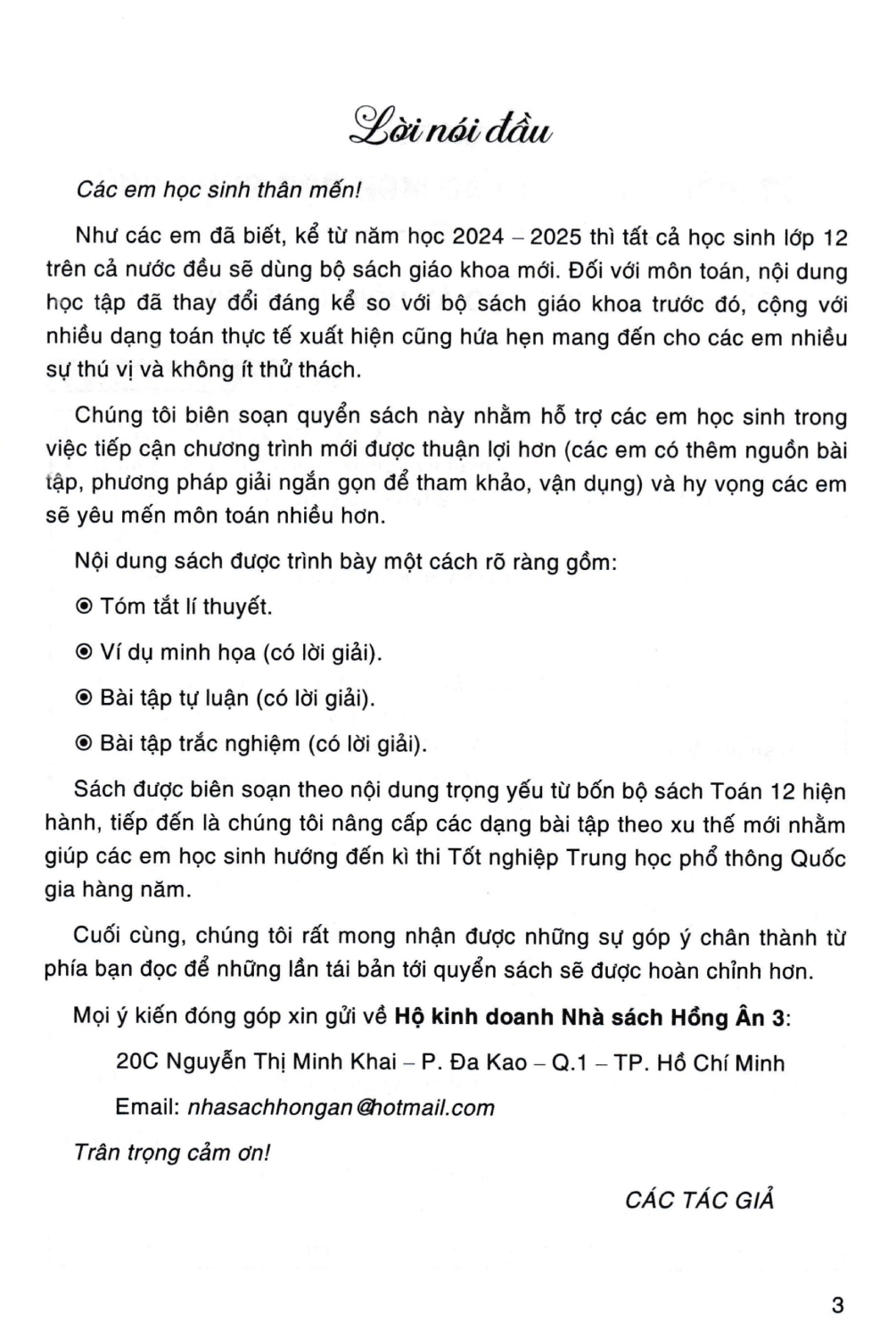 Sách được biên soạn theo nội dung trọng yếu từ bốn bộ sách Toán 12 hiện hành, tiếp đến là chúng tôi nâng cấp các dạng bài tập theo xu thế mới nhằm giúp các em học sinh hướng đến kì thi Tốt nghiệp Trung học phổ thông Quốc gia hàng năm.