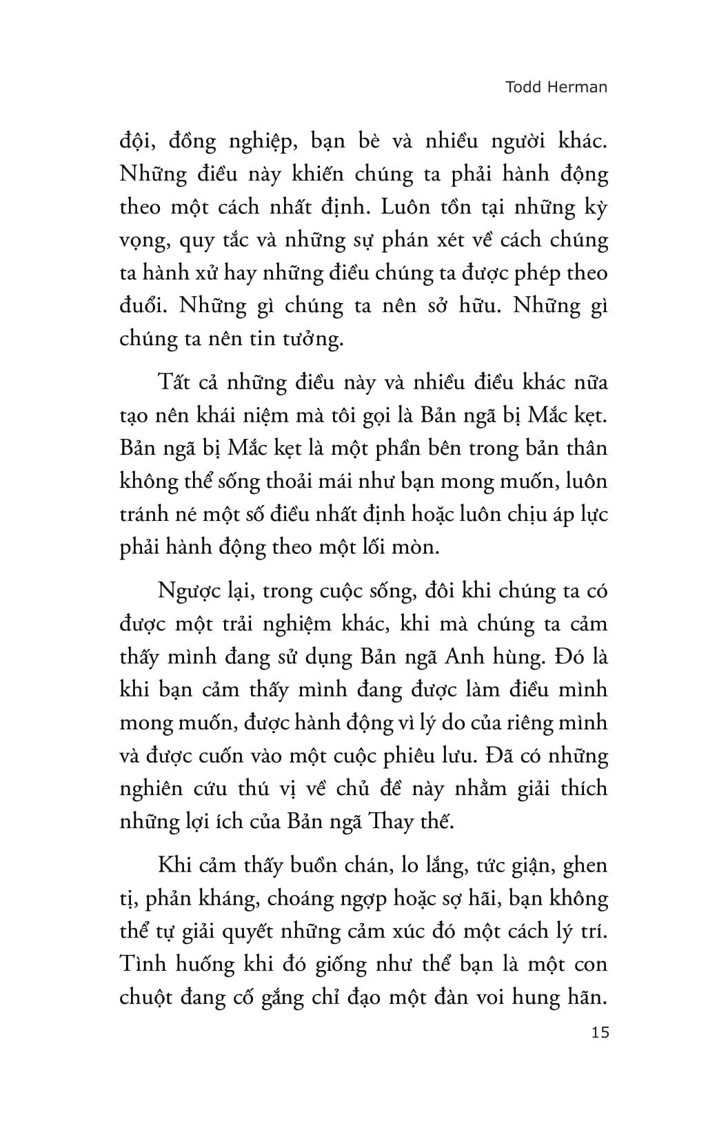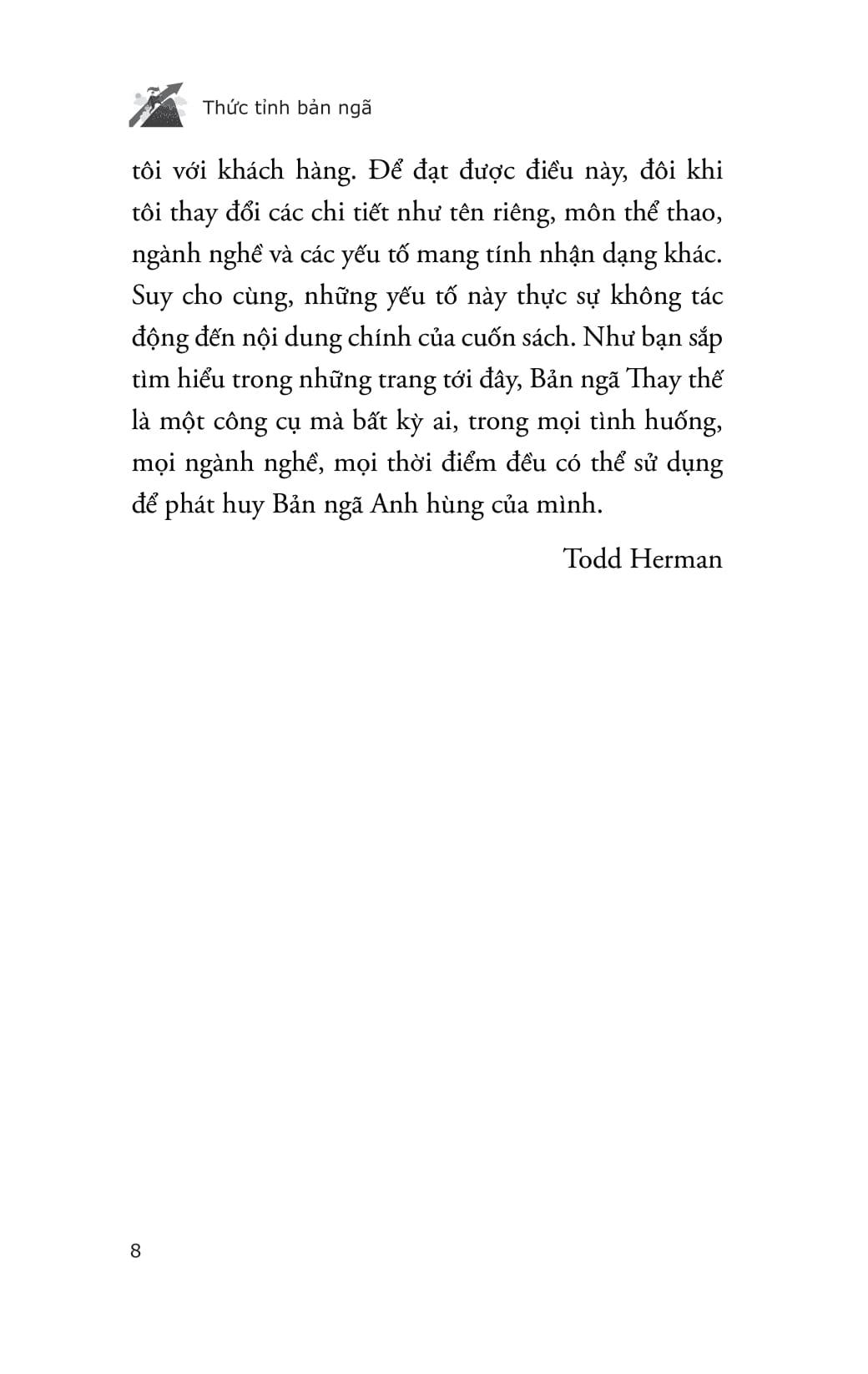• Tỏa sáng trong những khoảnh khắc quan trọng nhất của sự nghiệp và cuộc sống. Tác giả Todd Herman khẳng định: Chìa khóa để thành công không phải là trở thành người giỏi nhất ngay lập tức, mà là biết kích hoạt bản ngã mạnh mẽ nhất khi cần. Nếu bạn đang tìm kiếm phương pháp để vượt qua giới hạn và bước vào “phiên bản anh hùng” của chính m.ình, thì “Thức tỉnh bản ngã”là cẩm nang không thể bỏ qua. Về tác giả: Todd Herman là tác giả, diễn giả và huấn luyện viên về sức mạnh tinh thần, năng lực lãnh đạo và hiệu suất tối đa. Các chương trình đào tạo của ông đã tiếp cận hơn 2.000.000 người và đã giành được nhiều giải thưởng, trong đó có hai lần thắng giải Chương trình phát triển kỹ năng và lãnh đạo toàn cầu của năm. Ông là diễn giả nổi tiếng tại các sự kiện lớn. Hệ thống huấn luyện và đào tạo của ông được các đội nhóm trong NFL, NBA, NHL cũng như nhiều công ty lớn trên toàn thế giới sử dụng.