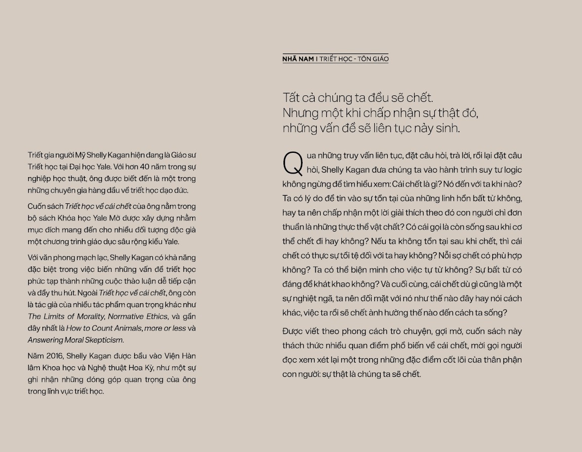 Qua những truy vấn liên tục, đặt câu hỏi, trả lời, rồi lại đặt câu hỏi, Shelly Kagan đưa chúng ta vào hành trình suy tư logic không ngừng để tìm hiểu xem: Cái chết là gì? Nó đến với ta khi nào? Ta có lý do để tin vào sự tồn tại của những linh hồn bất từ không, hay ta nên chấp nhận một lời giải thích theo đó con người chỉ đơn thuần là những thực thể vật chất? Có cái gọi là còn sống sau khi cơ thể chết đi hay không? Nếu ta không tồn tại sau khi chết, thì cái chết có thực sự tồi tệ đối với ta hay không? Nỗi sợ chết có phù hợp không? Ta có thể biện minh cho việc tự từ không? Sự bất từ có đáng để khát khao không? Và cuối cùng, cái chết dù gì cũng là một sự nghiệt ngã, ta nên đối mặt với nó như thế nào đây hay nói cách khác, việc ta rồi sẽ chết ảnh hưởng thế nào đến cách ta sống?
