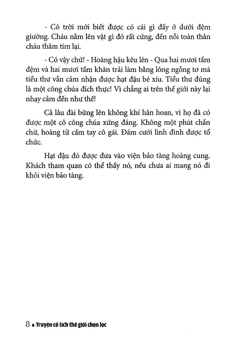 Truyện Cổ Tích Thế Giới Chọn Lọc - Công Chúa Và Hạt Đậu kể về ngày xửa ngày xưa, ở vương quốc nọ, có một hoàng tử muốn cưới vợ nhưng người vợ ấy phải hoàn thiện toàn mỹ. Hoàng tử bèn chu du khắp thiên hạ để kén vợ. Công chúa thì chẳng thiếu gì, nhưng nàng nào cũng có vài nhược điểm hoặc tật xấu. Thế là một ngày kia, hoàng tử đành buồn rầu trở về nhà. Đến tối, nổi lên một cơn giông tố kinh khủng. Mưa ào ào như xối. Có tiếng gõ cửa lâu đài. Lão vương thân chinh ra mở cửa...