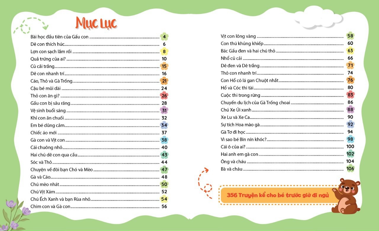 Những câu chuyện trong cuốn 365 Truyện kể cho bé trước giờ đi ngủ được tác giả tuyển chọn những truyện ngắn hay và mang ý nghĩa giáo dục sâu sắc sẽ góp phần nuôi dưỡng tâm hồn trẻ, giáo dục trẻ có những phẩm chất tốt như lòng yêu thương, lòng bao dung, trung thực, dũng cảm