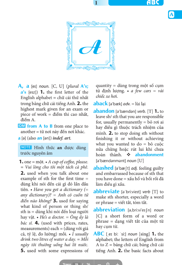 Cuốn sách “Oxford Learner’s Pocket Dictionary – Fourth Edition” giúp người đọc: - Tra từ vựng nhanh chóng, dễ hiểu. - Hiểu đúng cách dùng từ trong ngữ cảnh thực tế. - Cải thiện phát âm chuẩn. - Tăng vốn từ vựng học thuật và giao tiếp hằng ngày. Nội dung của cuốn “Oxford Learner’s Pocket Dictionary – Fourth Edition”: - The dictionary A-Z: Phần từ điển chính theo chữ cái từ A – Z. Trong đó, mỗi từ vựng bao gồm thông tin cần thiết về ý nghĩa, mẫu ngữ pháp, chính tả, thành ngữ và động từ phrasal. - Common irregular verb: Động từ bất quy tắc. - Geographical names: Tên địa lý. Ngoài ra, sách còn có các mục bổ trợ quan trọng: - Abbreviations and symbols used: Giải thích các ký hiệu và chữ viết tắt dùng trong sách. - Guide to the dictionary: Hướng dẫn sử dụng từ điển hiệu quả. - Key to phonetic symbols: Bảng ký hiệu phiên âm quốc tế (IPA). Điểm đặc biệt của cuốn sách: - Hơn 38.000 từ và cụm từ tiếng Anh thông dụng: Bao gồm cả từ vựng giao tiếp hằng ngày lẫn từ học thuật thường gặp, giúp người học mở rộng vốn từ một cách toàn diện. - Định nghĩa đơn giản, dễ hiểu – chuẩn Oxford: Giải thích bằng ngôn ngữ rõ ràng, dễ tiếp cận, đặc biệt phù hợp với người học tiếng Anh không phải bản ngữ. Có ghi chú ngữ pháp, từ loại, từ đồng/trái nghĩa, giúp hiểu sâu hơn về cách dùng từ, hỗ trợ viết và nói tiếng Anh chính xác hơn. - Ví dụ minh họa thực tế, sát với ngữ cảnh sử dụng: Mỗi từ đều đi kèm ví dụ rõ ràng, gần gũi với đời sống, giúp người học hiểu ngay cách dùng từ trong giao tiếp hằng ngày và viết học thuật. - Kích thước bỏ túi – nhỏ gọn, tiện lợi: Dễ dàng mang theo học mọi lúc, mọi nơi – phù hợp cho học sinh, sinh viên, người đi làm và người tự học. Trên đây là những nội dung nổi bật của cuốn Oxford Learner’s Pocket Dictionary – Fourth Edition mà chúng tôi muốn gửi đến quý bạn đọc. Hy vọng cuốn từ điển nhỏ gọn nhưng giàu giá trị này sẽ trở thành người bạn đồng hành đáng tin cậy trong hành trình học tiếng Anh của bạn – giúp bạn tra nhanh, hiểu đúng, dùng chuẩn mọi lúc mọi nơi. Chúc bạn học tiếng Anh thật hiệu quả cùng Oxford Learner’s Pocket Dictionary – Fourth Edition!